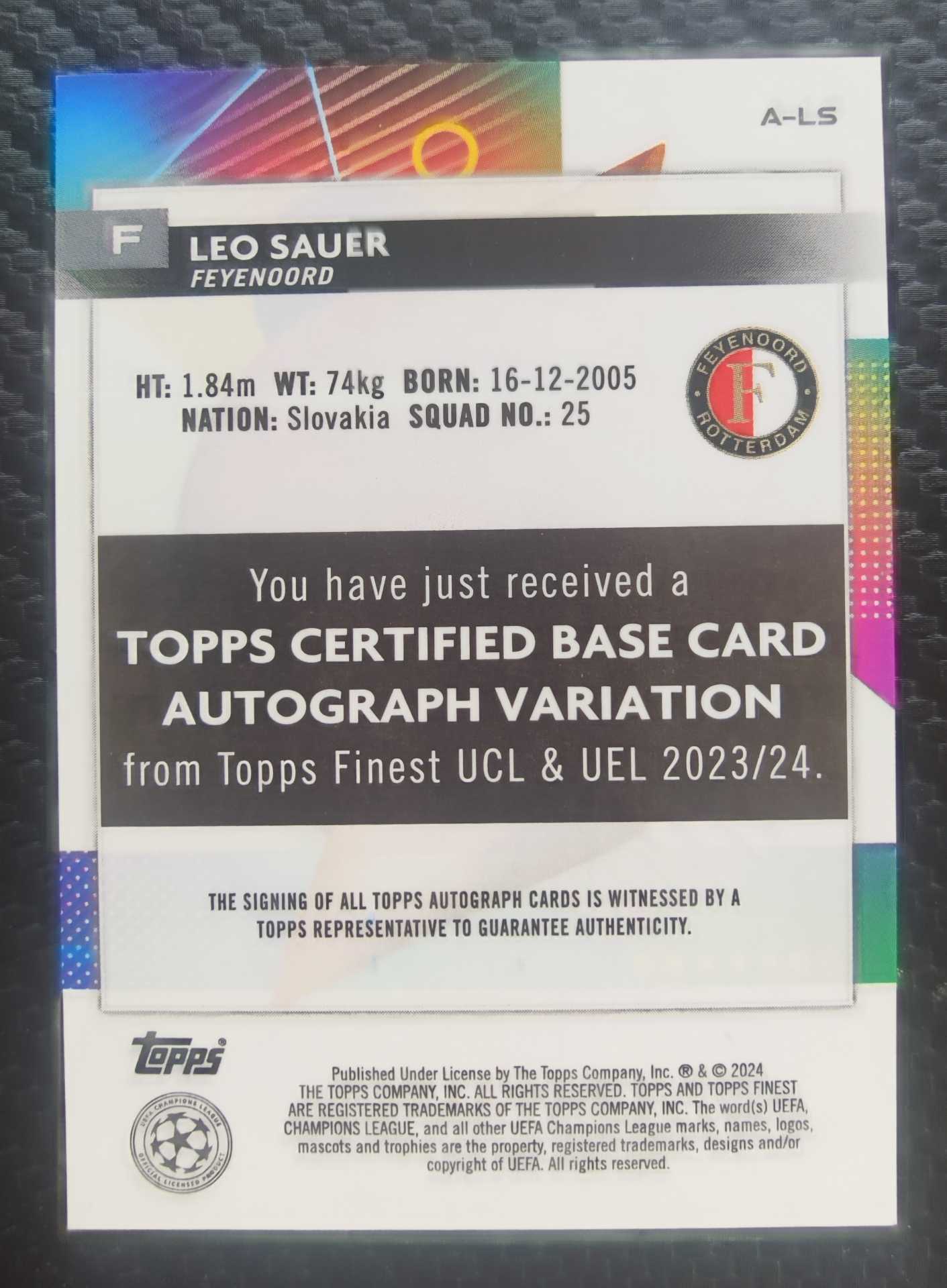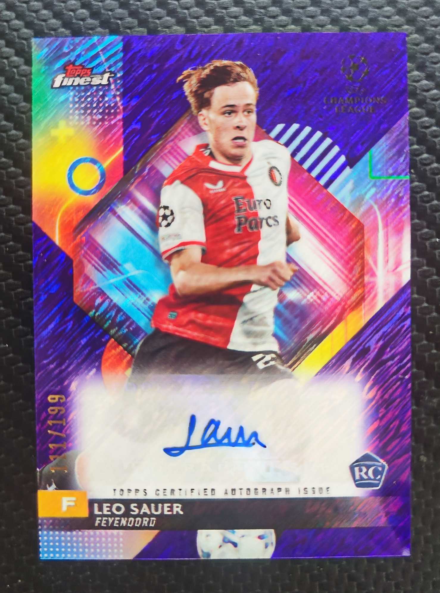 2024 Topps Finest Leo Sauer RC 欧冠 斯洛伐克 费耶诺德 新秀 莱奥 邵尔 199编 紫折射 墨迹完美 签字 签名 实卡精美 卡品见图 阅读描述