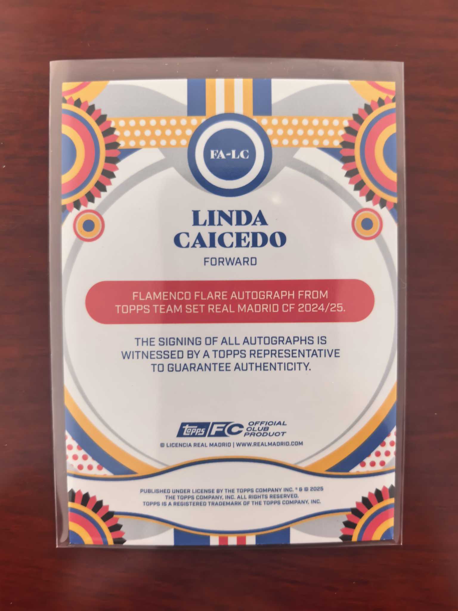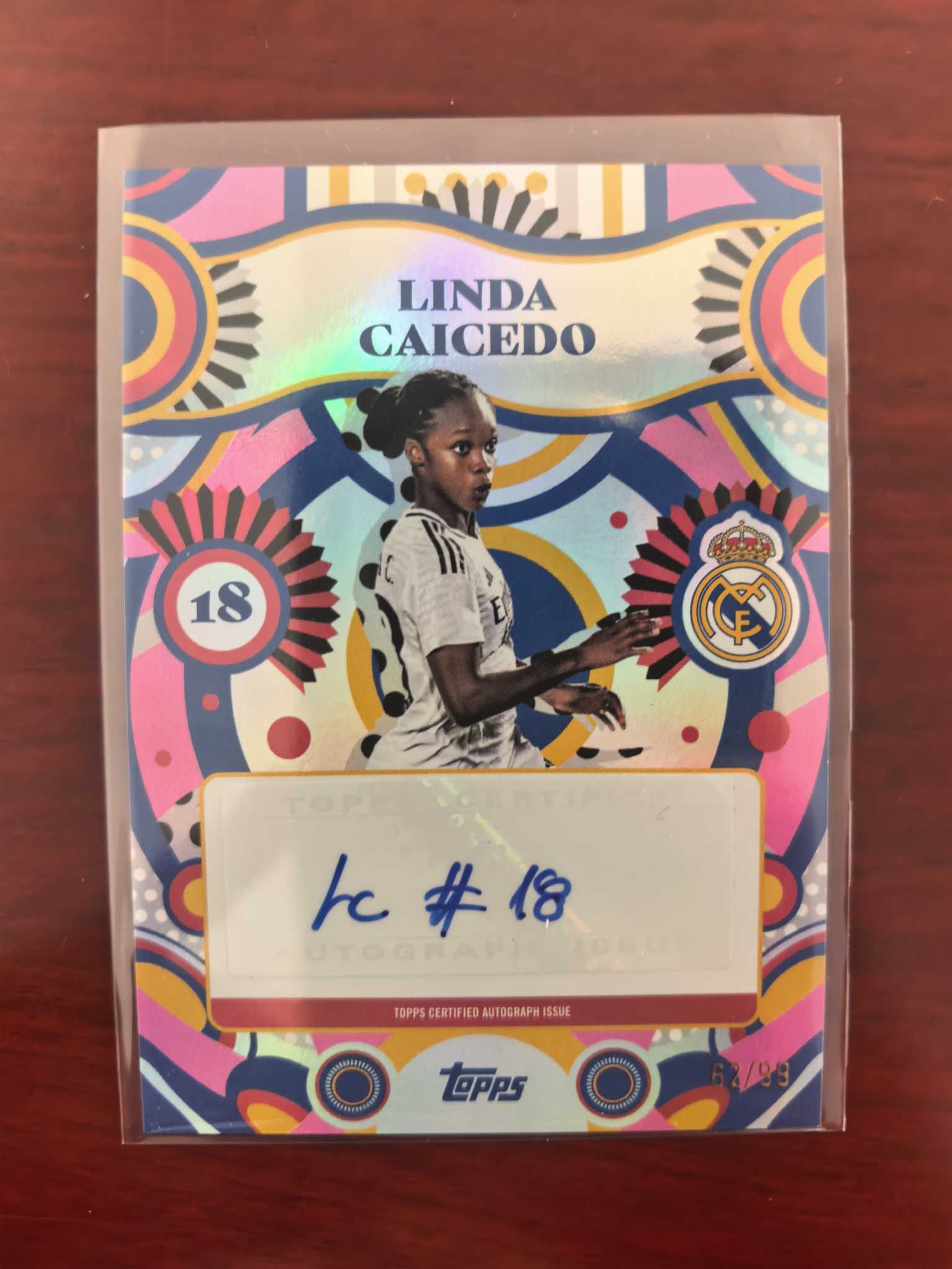 2025 Topps 皇家马德里队盒 LINDA CAICEDO 琳达·凯塞多 签字 99编 粉折 弗拉门戈风采签 背号签 哥伦比亚 皇马 女足 荣获科帕将提名 未来可期