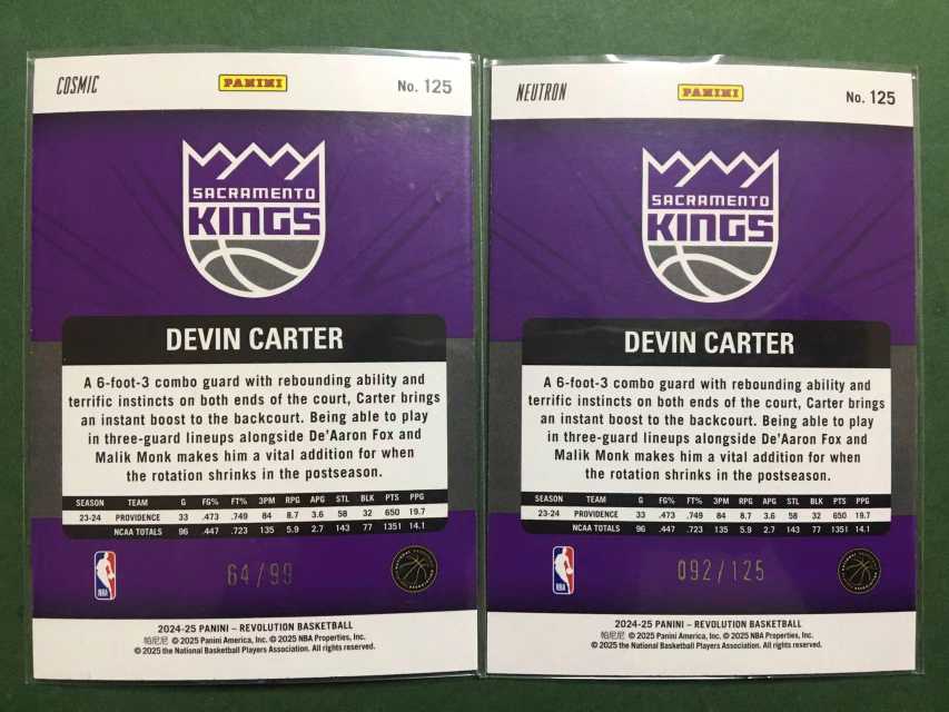 2024-25 Panini Revolution Devin Carter RC 革命 新秀 国王 德文 卡特 99编 COSMIC 125编 NEUTRON 折射 2张lot 不保卡品#十五
