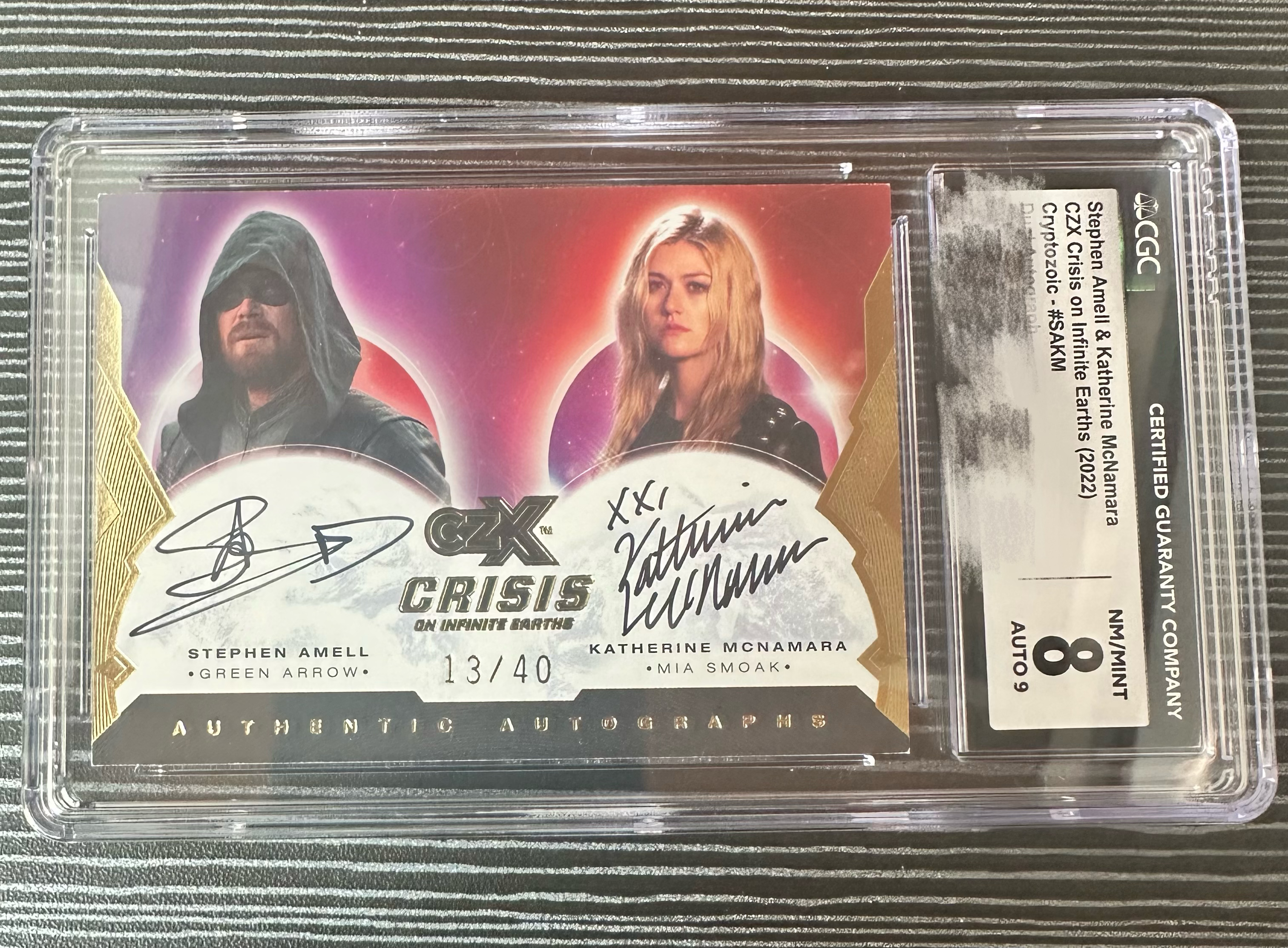 2022 SkyBox Cryptozoic DC CZX DC美剧 寒武纪 Arrow 绿箭侠 无限地球危机 斯蒂芬·阿梅尔 凯瑟琳·麦纳马拉 父女 演员签双人签签字 /40编 如图 /蝙蝠侠闪电侠