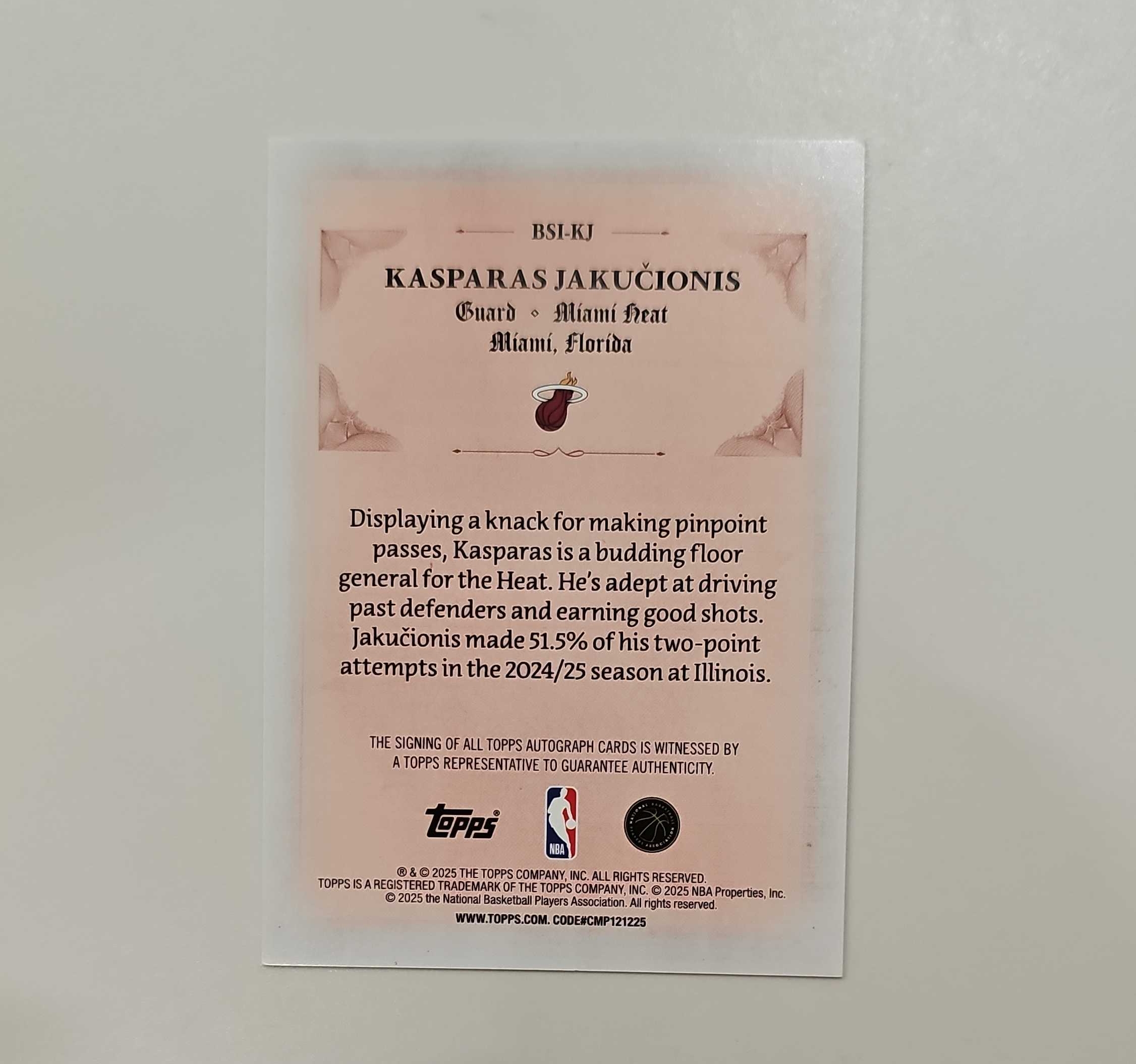 2025 Topps flagship kaspars jakucionis RC 【幻想代拍】热火 亚库奇奥尼斯 新秀RC 签字 实卡精美 收藏必备(奶茶)