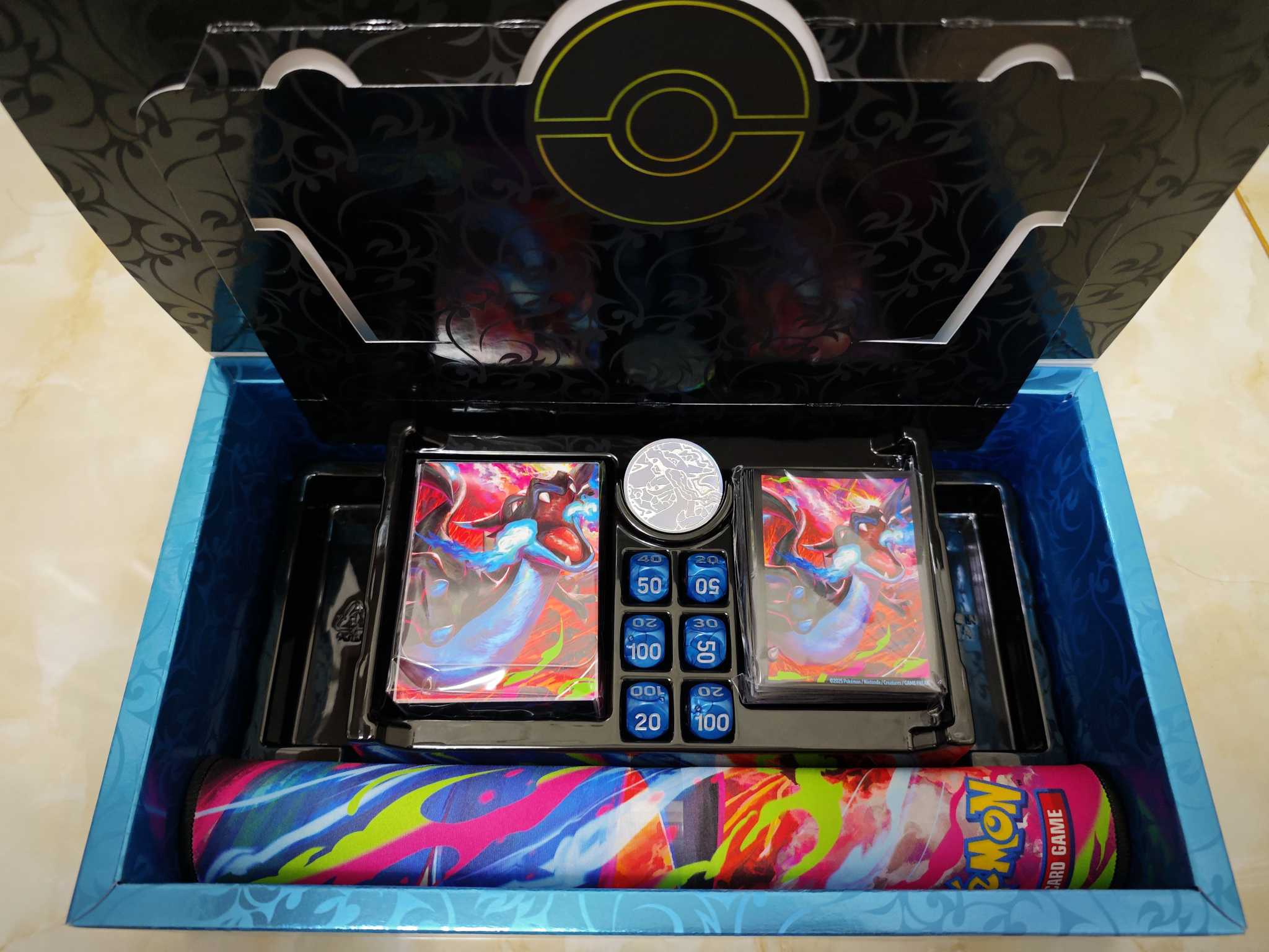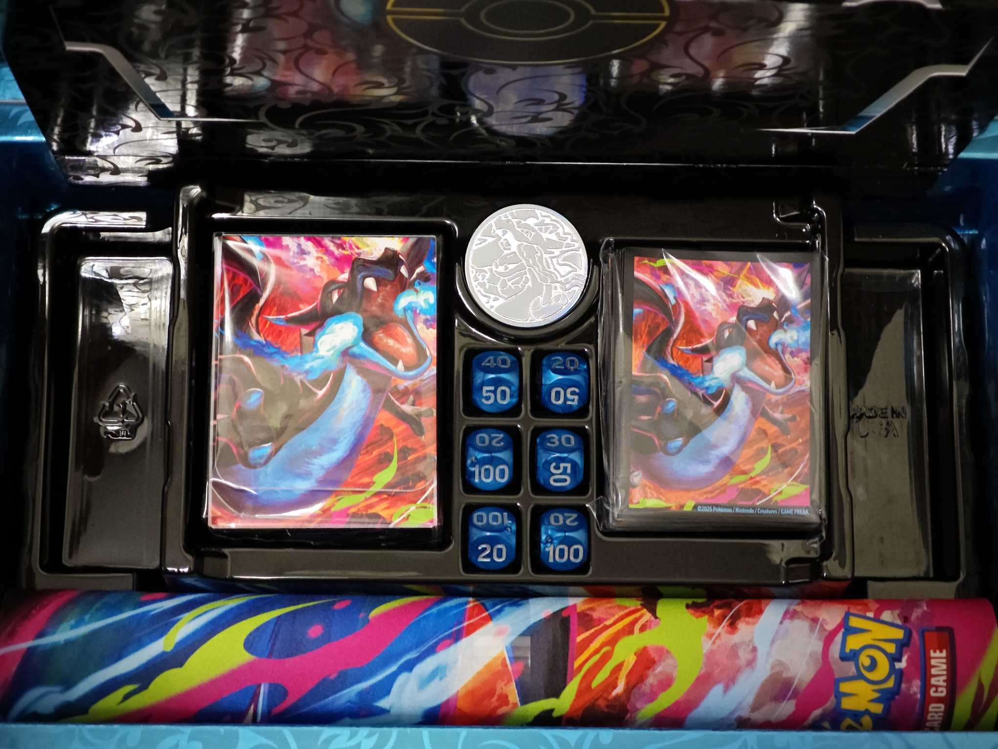 2025 Pokemon TCG 美版 喷火龙upc礼盒 所有周边 不含p卡及卡包 包含喷火龙卡垫 卡套 卡盒 骰子 金属折射硬币