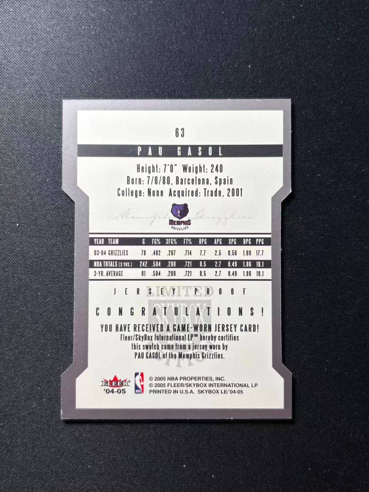 【梦卡拍卖】2004-05 Fleer Pau Gasol 球衣切割 物料 GU 保罗 加索尔 马刺 灰熊 湖人 #DD# A01