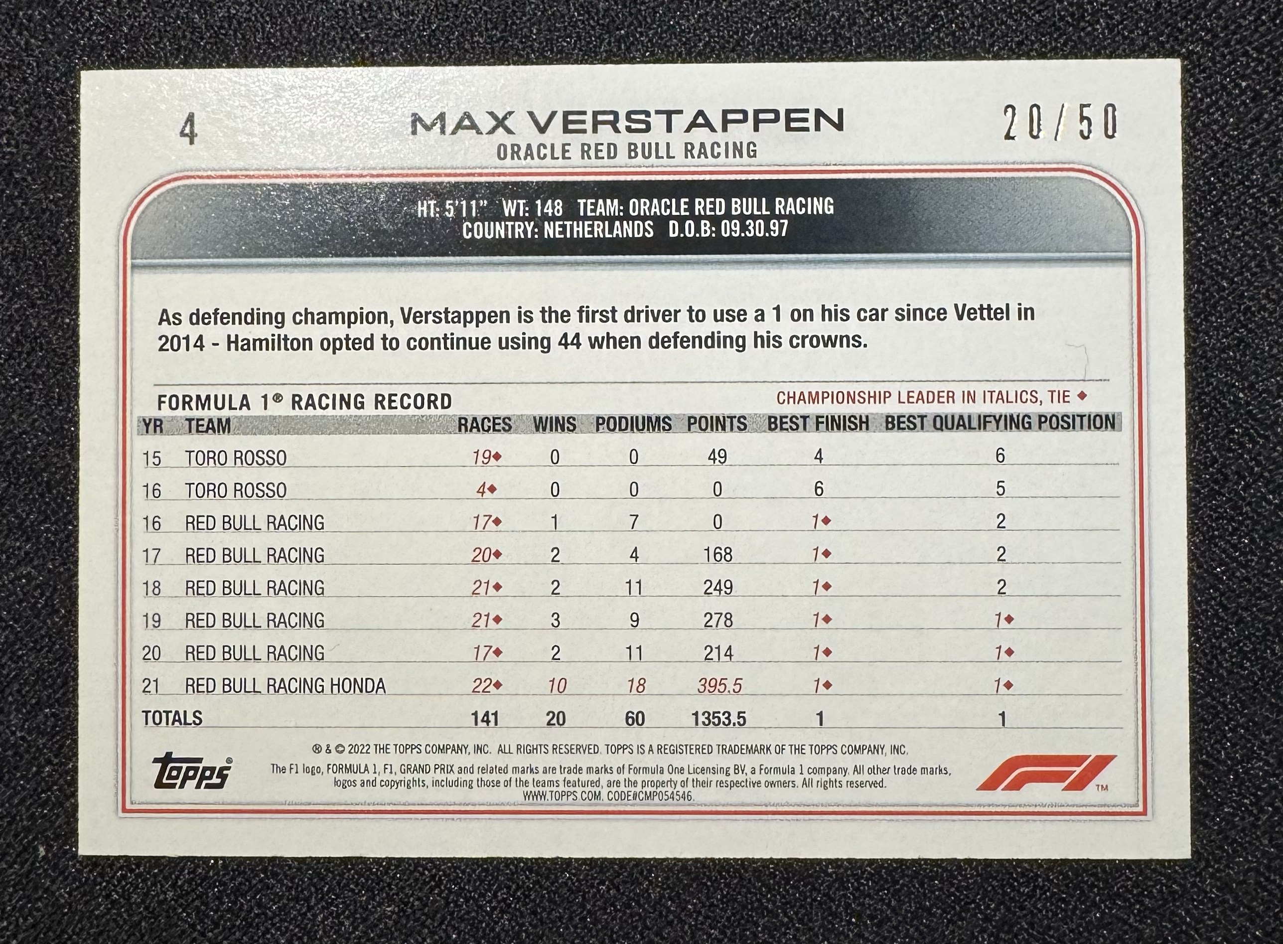 2022 Topps Formula 1 Max Verstappen F1 维斯塔潘 汽车人 50编 四冠王 红牛车队 收藏凑套必备