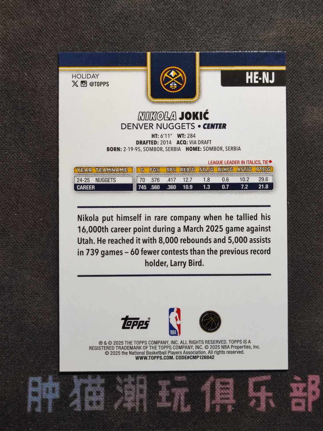 【肿猫球星卡潮玩俱乐部】实体店铺,信誉保障。购买须知:①所有卡的品相为通行品如有重大品相残次问题会在描述中注明。木盒、手提、国宝、IMM、Noir、小真金等等厚卡系列的卡片,有轻微白边白角属于正常品相,折射卡、镜面卡有机械划痕、印刷线属于正常品相,所有卡片不保证后续评级分数。②拍卖卡片不含卡具,自带官方原封砖、原封夹的除外,收到有卡具属于赠送性质,不接受因卡具问题维权,带有原封卡砖、卡夹的卡不保证卡品介意勿拍。③卡片截标后请于3日内通过卡淘线上进行付款,本店保证付款后24小时之内发货,3日内不付款第四日关闭订单,不接受后续协商重开,请免开尊口,本店所有卡片均不支持累计。④签收时请拆封仔细检查卡片品相并录制拆箱视频以便佐证,如果有疑问请于快递签收3日内通过内站内信联系客服,超过3日客服将不予受理。如若遇到快递运输造成卡品损坏与丢失问题,属快递公司的工作失误,本店不予赔偿,但会积极配合买家追诉快递公司的赔偿责任,协助买家将损失降到最低。发货时默认卡淘后台收货人信息,如有其它收货地址,请付款前私信客服提供地址,因地址问题发生纠纷请参考卡淘平台规则。为保证服务质量,本店发货只发顺丰陆运寄付,运费18元,超过首重退运费发顺丰到付,偏远地区(如海南、新疆、西藏、青海、甘肃、内蒙古、云南、广西、宁夏、江西、贵州、港澳台地区)顺丰到付。本店卡淘客服工作时间为:每周一~周五 9:00-17:00,按国家法定节假日公休,由于卡淘工作量巨大,如有怠慢请谅解。更多了解,欢迎加入官方QQ群(天津肿猫球星卡:637855320),店内微信客服(肿猫客服:13001360442)