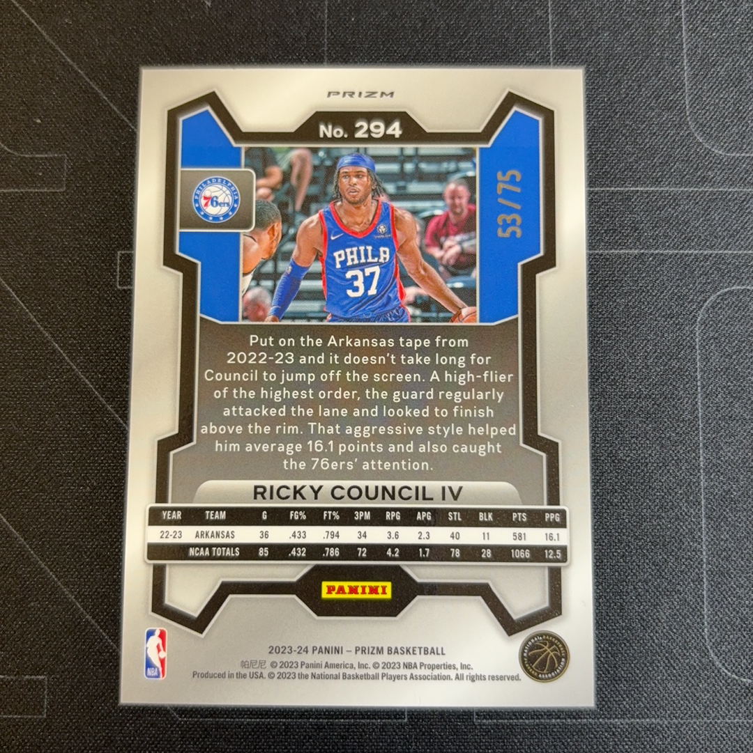 【风速狗】2023-24 帕尼尼 Panini Prizm 篮球Pz系列 NBA76人 Ricky Council IV 里奇 康西尔四世 新秀RC 53/75编 小胖