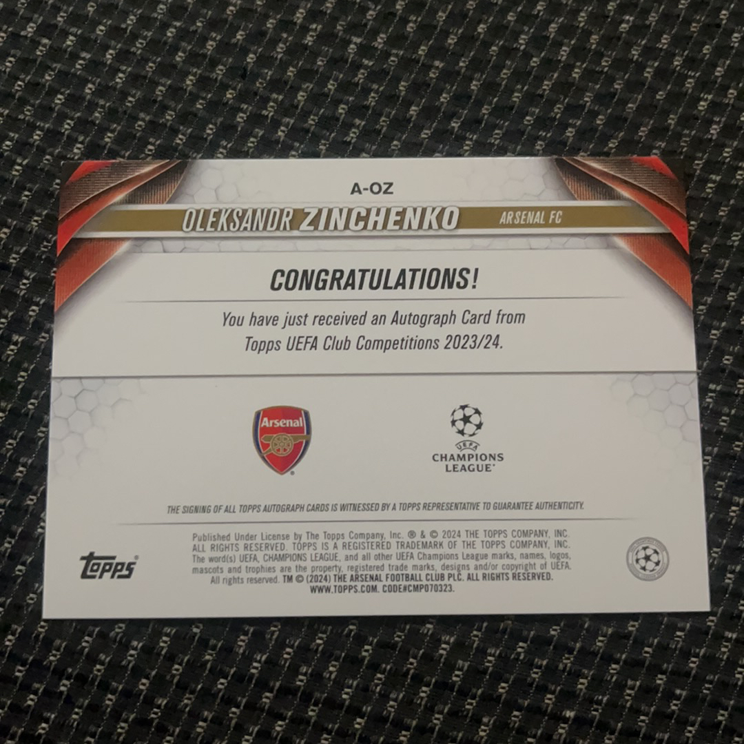 2023-24 Topps UCC Oleksandr Zinchenko 津琴科 欧冠ucc 完美签字 阿森纳 曼城 边路飞翼 乌克兰🇺🇦队长 实力不俗 值得收藏 舍甫琴科 赖斯 厄德高 75