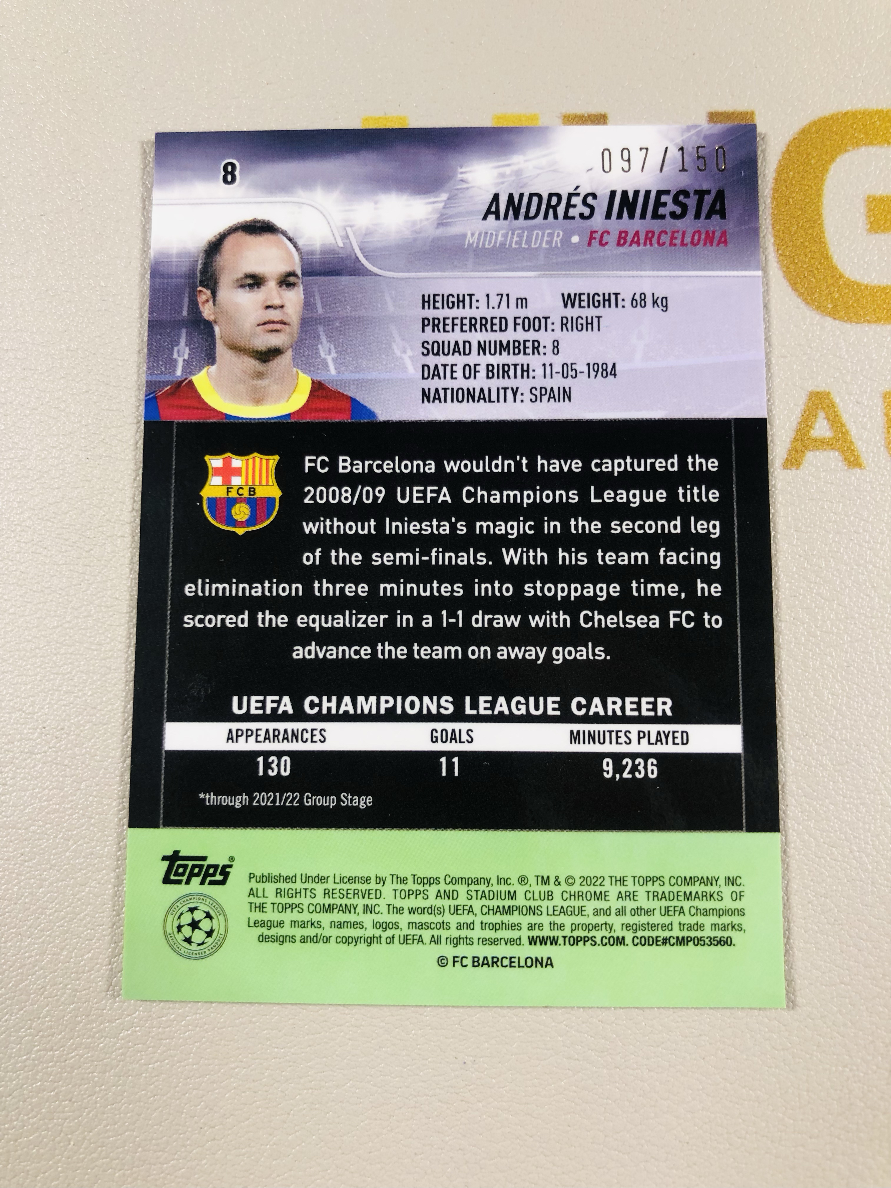 2022 Topps Chrome Andres Iniesta 欧冠 Chrome 竞技场 巴塞罗那 伊涅斯塔 埃托奥 097/150编 单卡低于10元无卡夹介意勿拍 磁铁1113