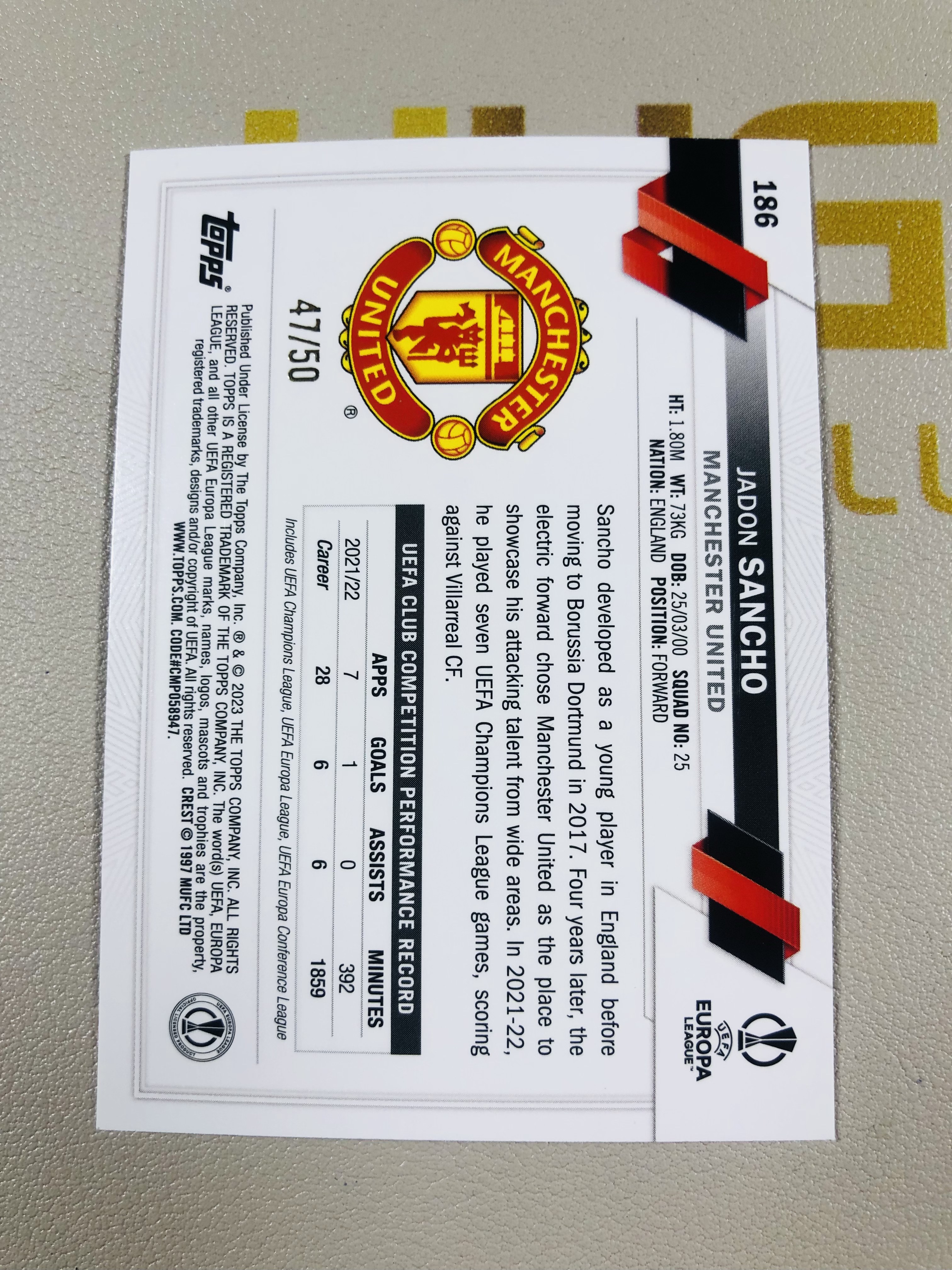 2023 Topps UCC Jadon Sancho 欧冠 UCC 碧玉 曼联 桑乔 50编 单卡低于10元无卡夹介意勿拍 磁铁1113