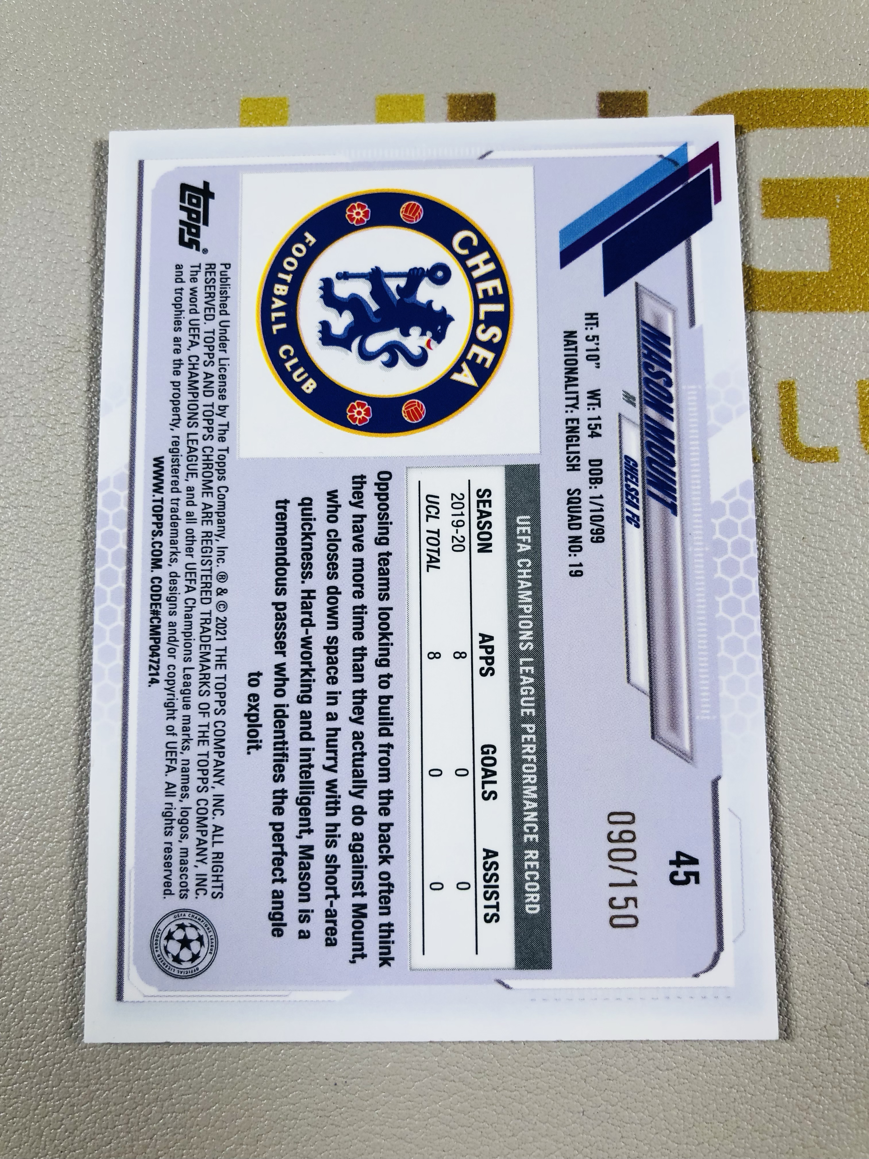 2021 Topps Chrome Mason Mount 欧冠 Chrome 蓝宝石 切尔西 芒特 150编 单卡低于10元无卡夹介意勿拍 磁铁1113