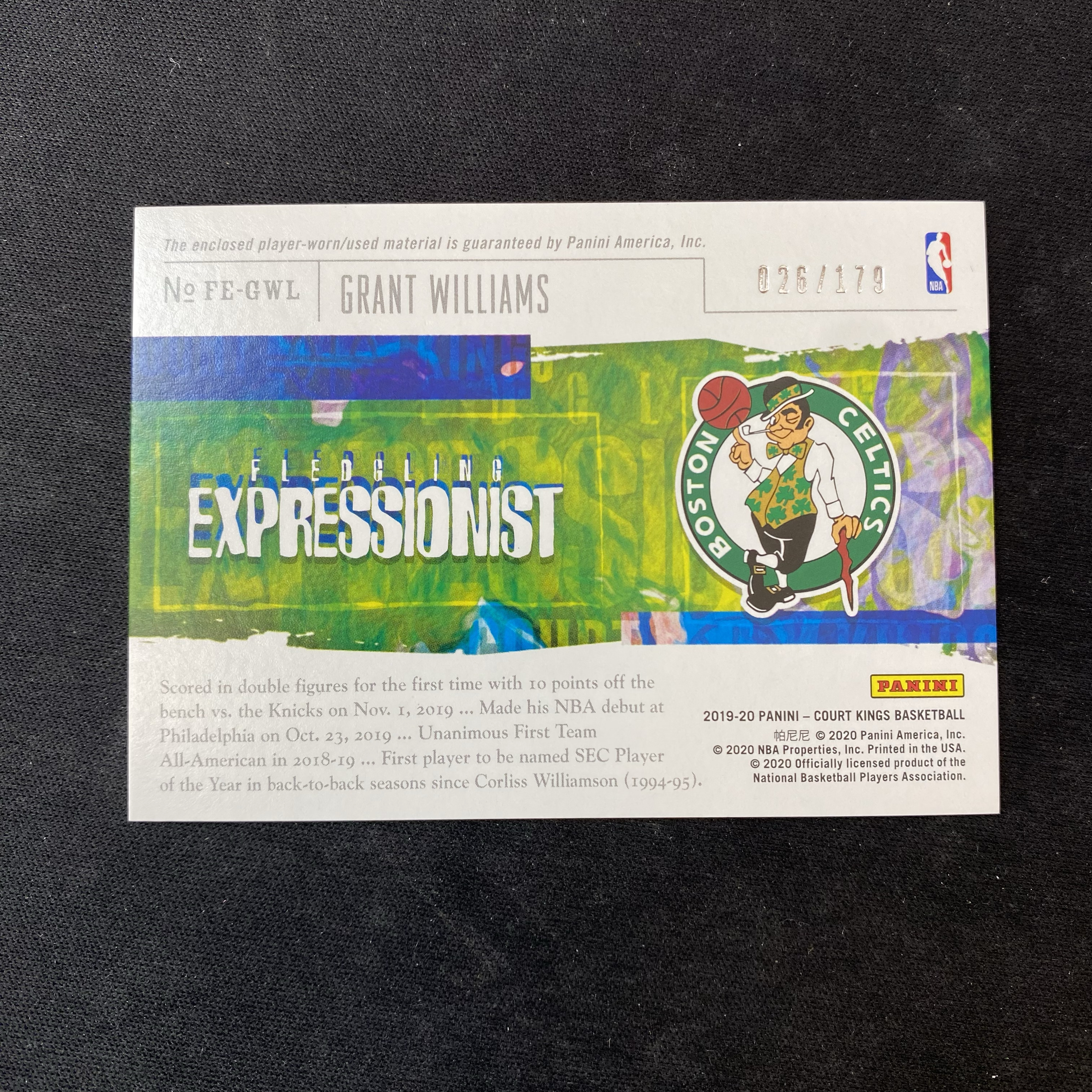 2019-20 Panini Court Kings Grant Williams RC 【星集卡代卖】钱鸭1119 油画 新秀 格兰特 威廉姆斯 格威 小窗球衣 物料 179编 特卡