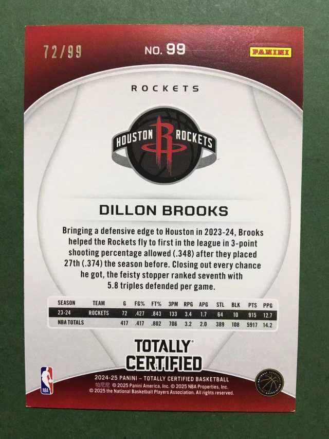 2024-25 Panini Totally Certified Dillon Brooks 卫生巾 火箭 狄龙 布鲁克斯 99编 蓝折 蓝平行 太阳 杰伦格林 布克队友 防守悍将 卡品如图#冯