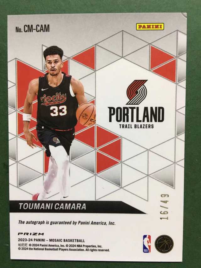 2023-24 Panini Mosaic Toumani Camara RC 马赛克 新秀 图马尼 卡马拉 49编 签字 蓝马赛克折 蓝折 COLLAGE 文班 阿门同届 亨德森队友 左角微瑕#冯