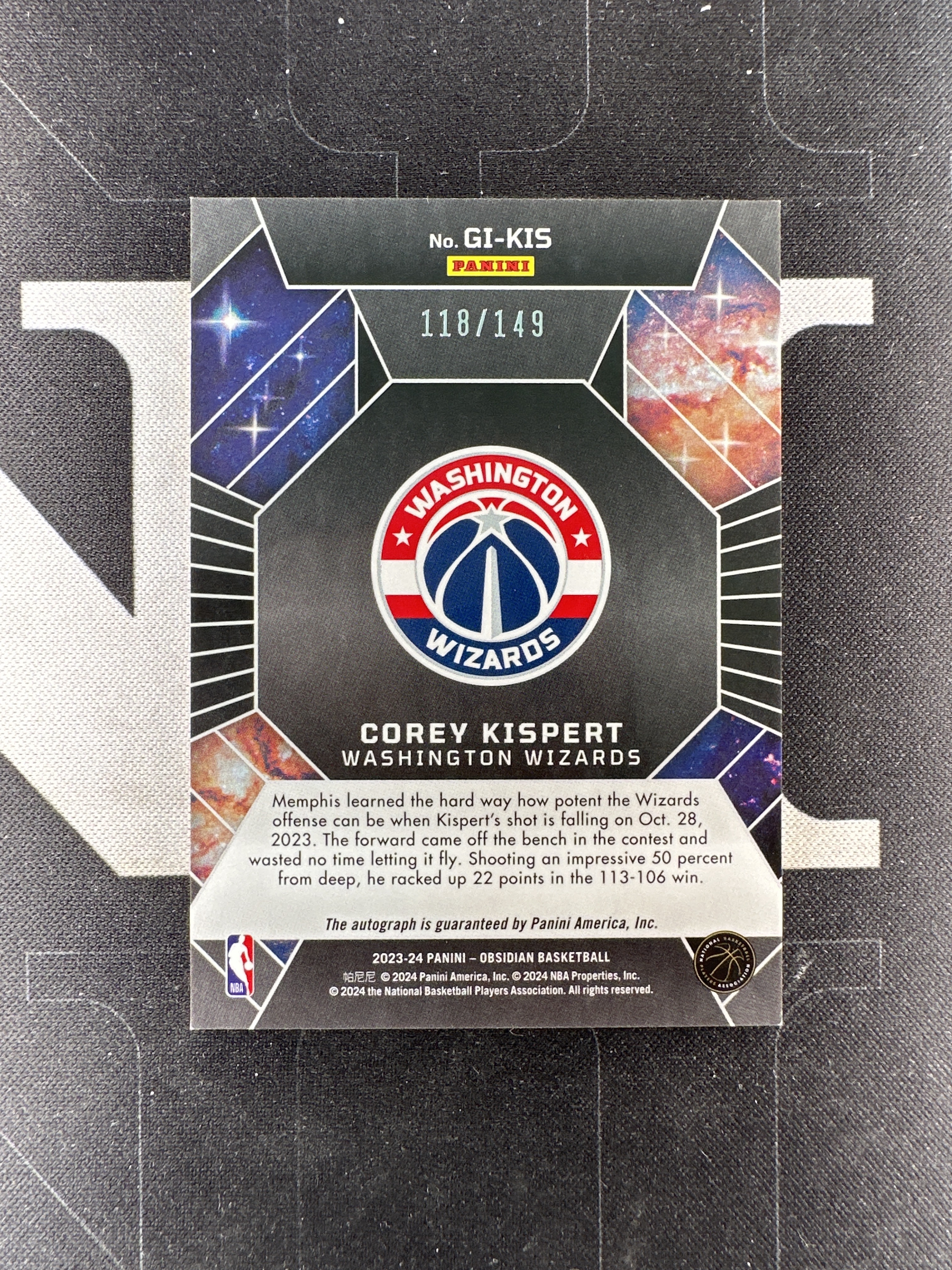 2023-24 Panini Obsidian Corey Kispert 【星卡岛卡社】23-24 黑曜石 奇才 基斯珀特 INK贴签 118/149编 卡品完美 收藏必备(老王)