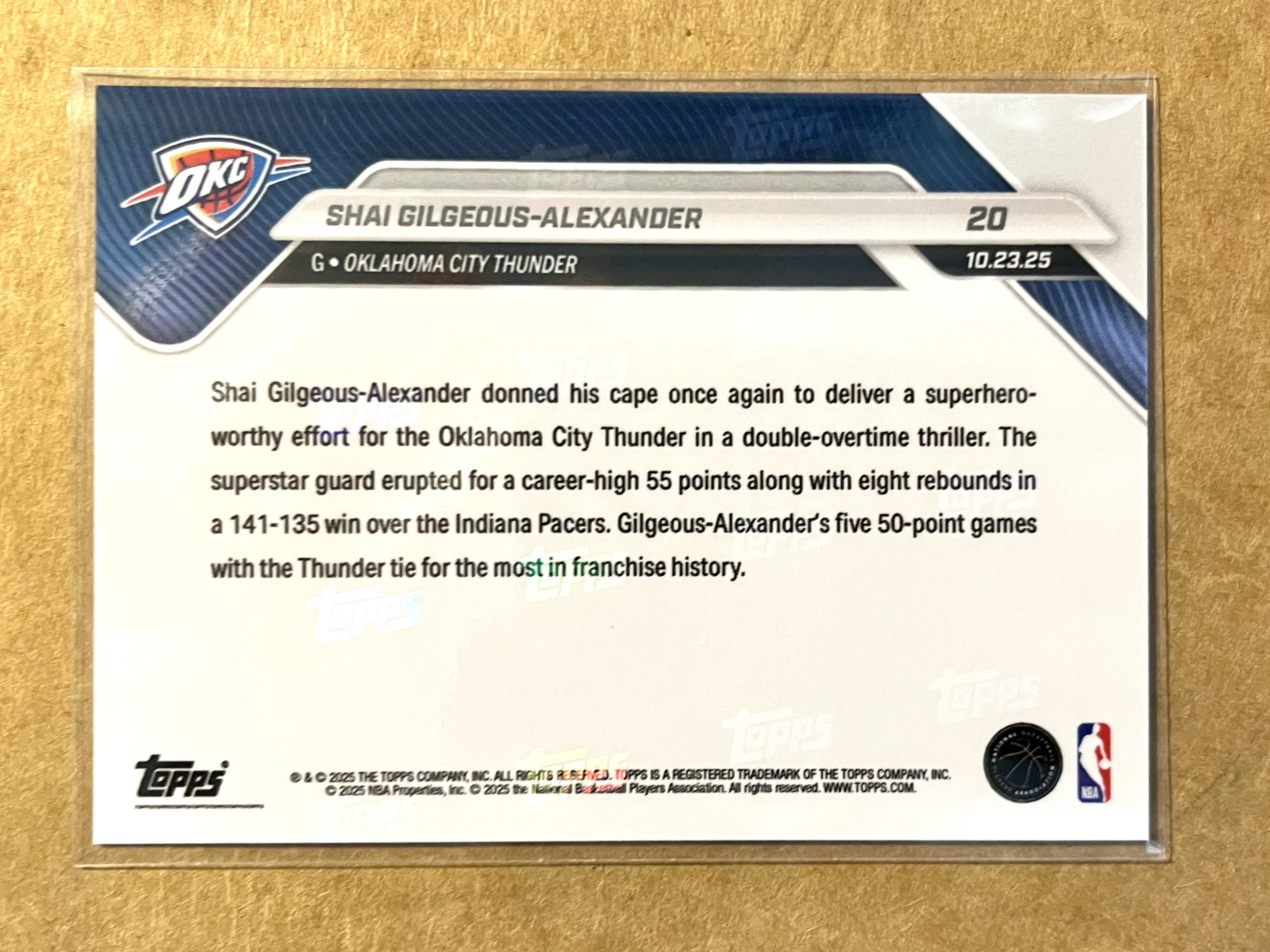 2025 Topps 【蓝矿】 Shai Gilgeous-Alexander 谢伊·吉尔杰斯·亚历山大 Topps now系列 2025NBA常规赛 雷霆 生涯新高5次50分表现追平队史得分最高纪录
