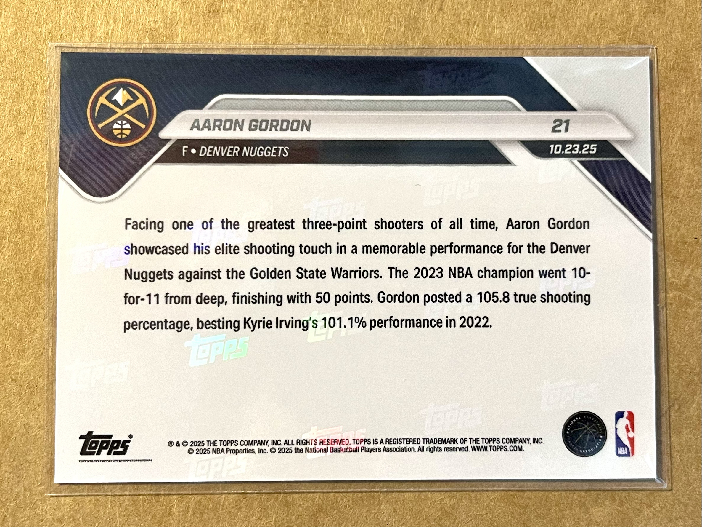 2025 Topps 【蓝矿】 Aaron Gordon 阿隆·戈登 Topps now系列 2025NBA常规赛 掘金 状态火热不输库里!三分球11投10中,全场得分50分!