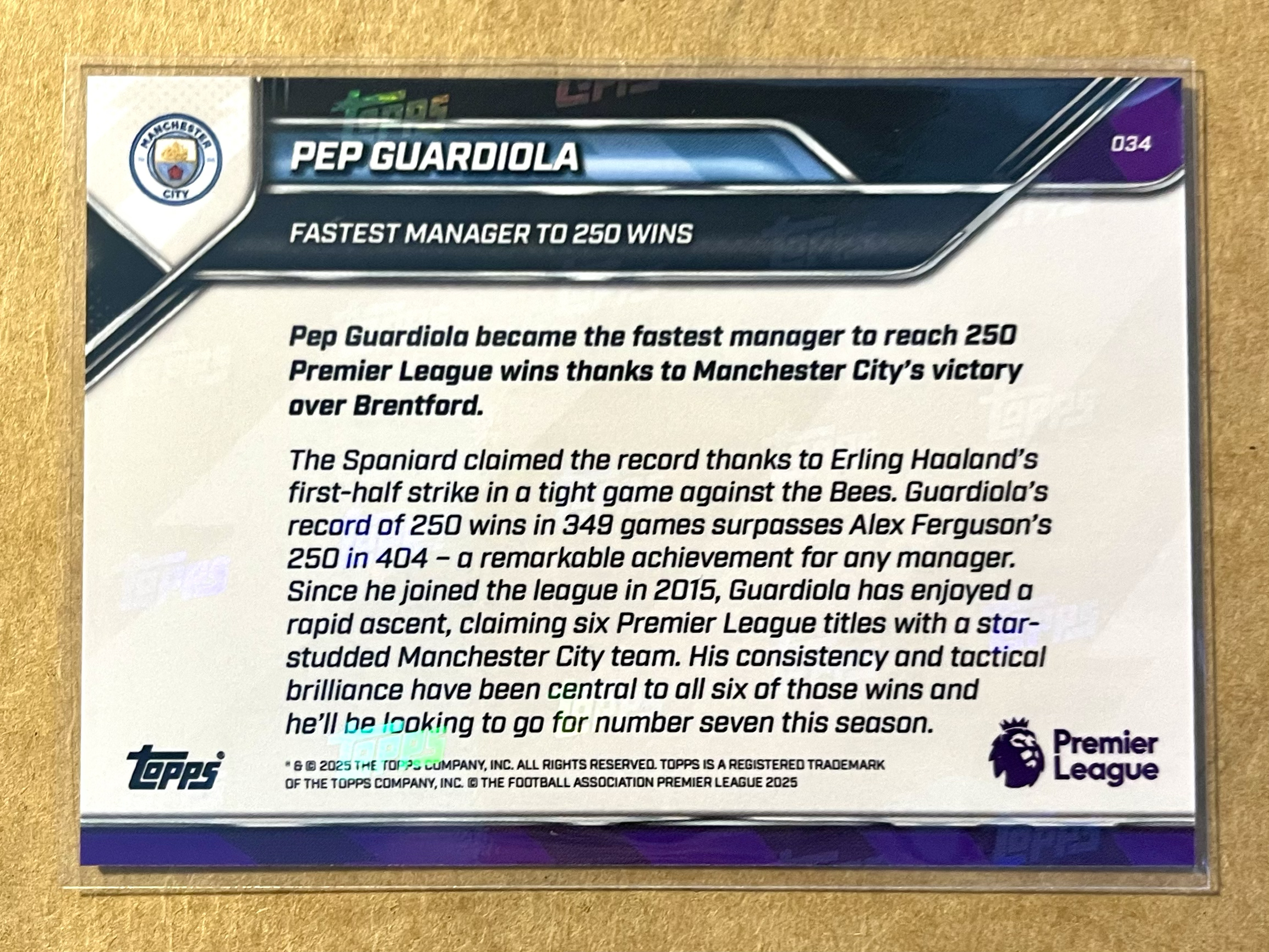 2025 Topps 【蓝矿】 Pep Guardiola 瓜迪奥拉 Topps now系列 英超 曼城 教练 破茧重生,主动求变,能打败他的只有他自己!英超纪录:带队349场达到250场次最快胜利!