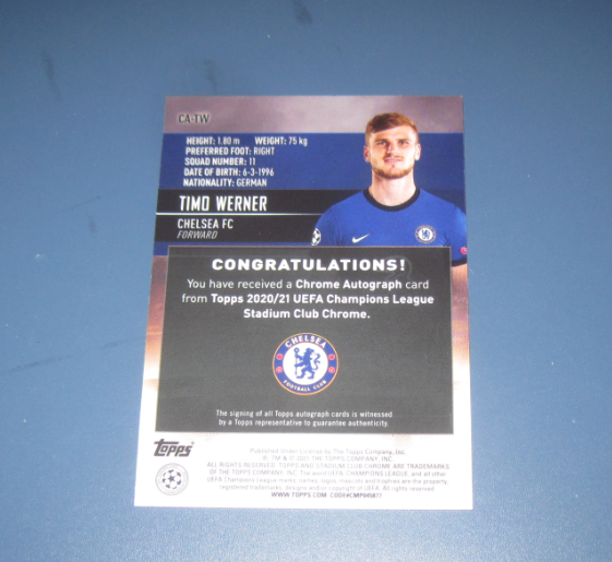 2020-21 Topps Stadium Club Chrome Timo Werner 【凯哥拍卖】 欧冠 竞技场 球星卡 签字卡 切尔西 维尔纳 极微小瑕疵 品相如图