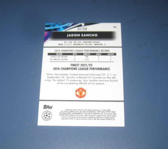 2021-22 Topps Finest Jadon Sancho 【凯哥拍卖】 欧冠 球星卡 折射 限量 01/50编 曼联 桑乔 极微小瑕疵 品相如图