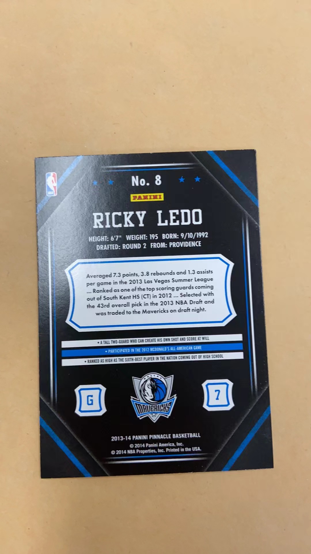 2013-14 Panini Pinnacle Ricky Ledo RC 巅峰 独行侠 理查德 莱多 新秀 热门球星 硬通货 卡品精美 凑套必备 收藏必备