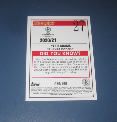 2020-21 Topps Merlin chrome Tyler Adams 【凯哥拍卖】 欧冠 球星卡 折射 限量199编 莱比锡 泰勒亚当斯 极微小瑕疵 品相如图