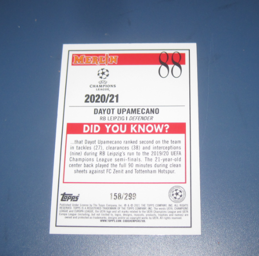 2020-21 Topps Merlin chrome Dayot Upamecano 【凯哥拍卖】 欧冠 球星卡 折射 限量299编 莱比锡 于帕梅卡诺 极微小瑕疵 品相如图