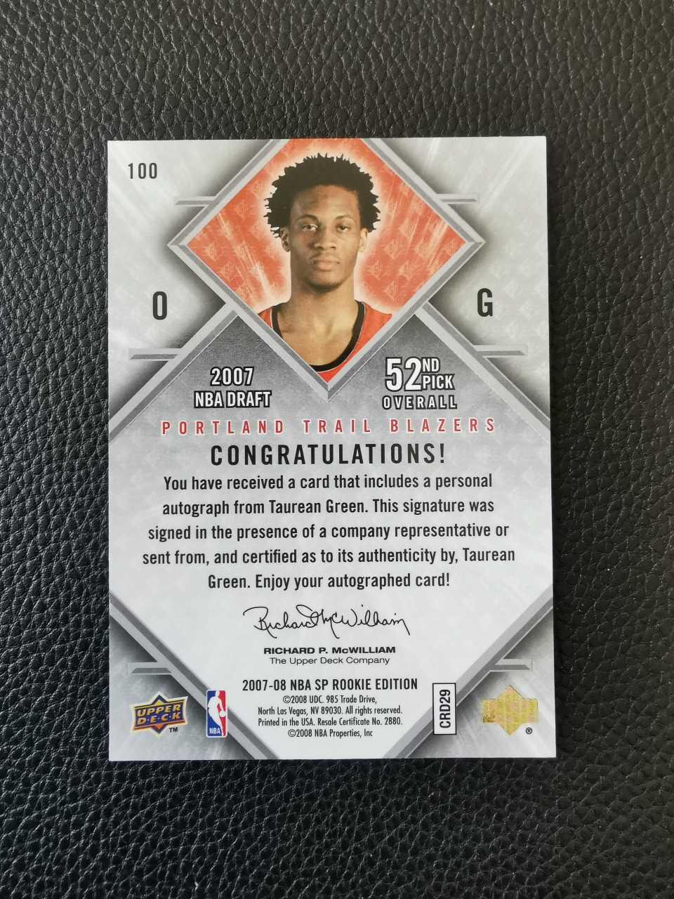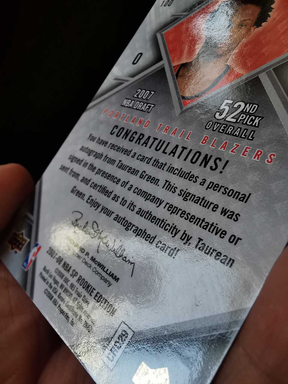 【金矿拍卖】2007-08 upper deck ud sp rookie edition 开拓者新秀rc 陶林格林 托里恩 taurean green 签字 背轻印 小天