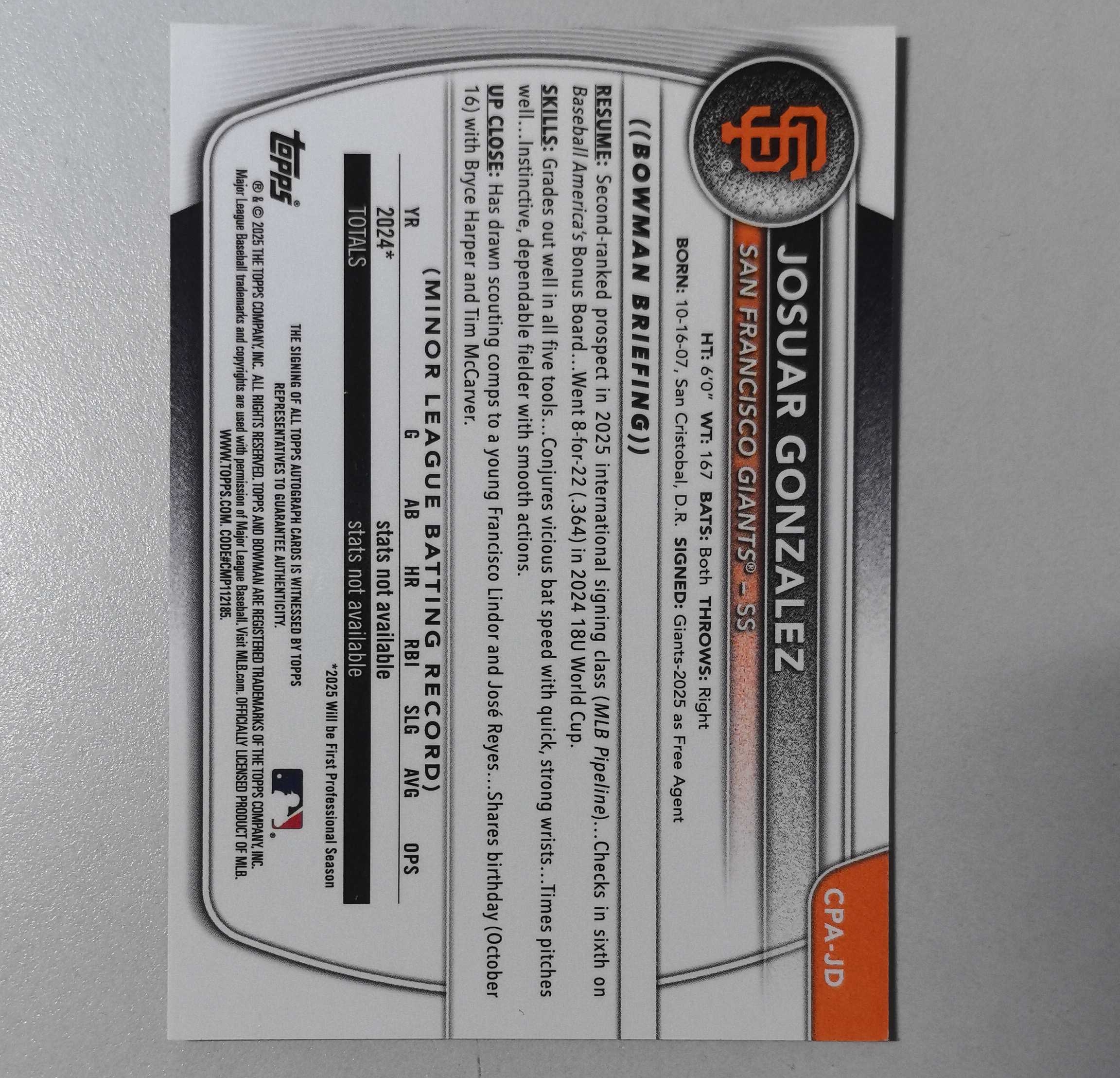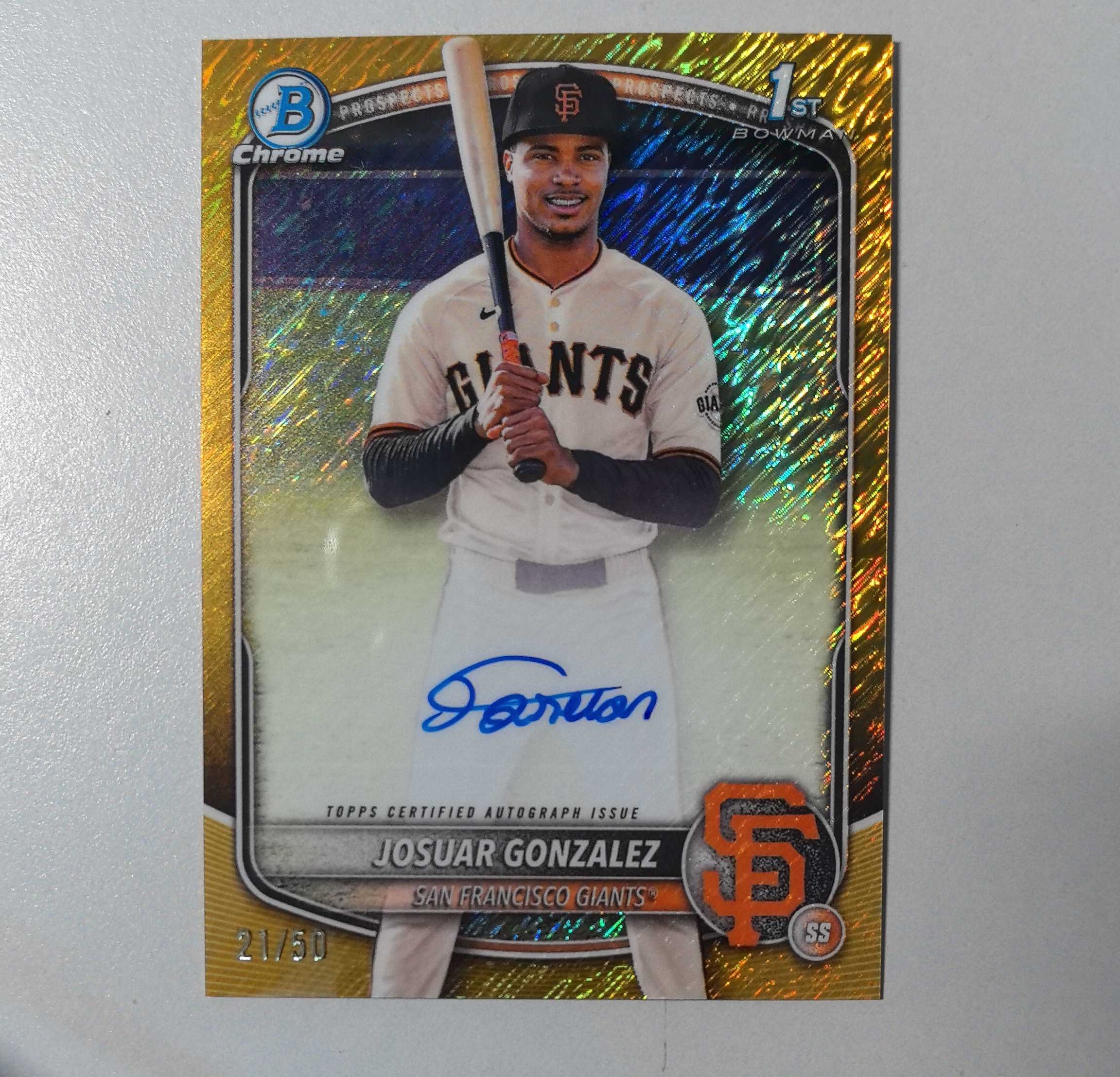 2025 Topps 【锡安代卖】 累计照常 棒球mlb bowman 1st新秀签字卡签 金shimmer折50编 旧金山巨人海外头号大物 Josuar gonzalez 卡品如图 卖卡锡
