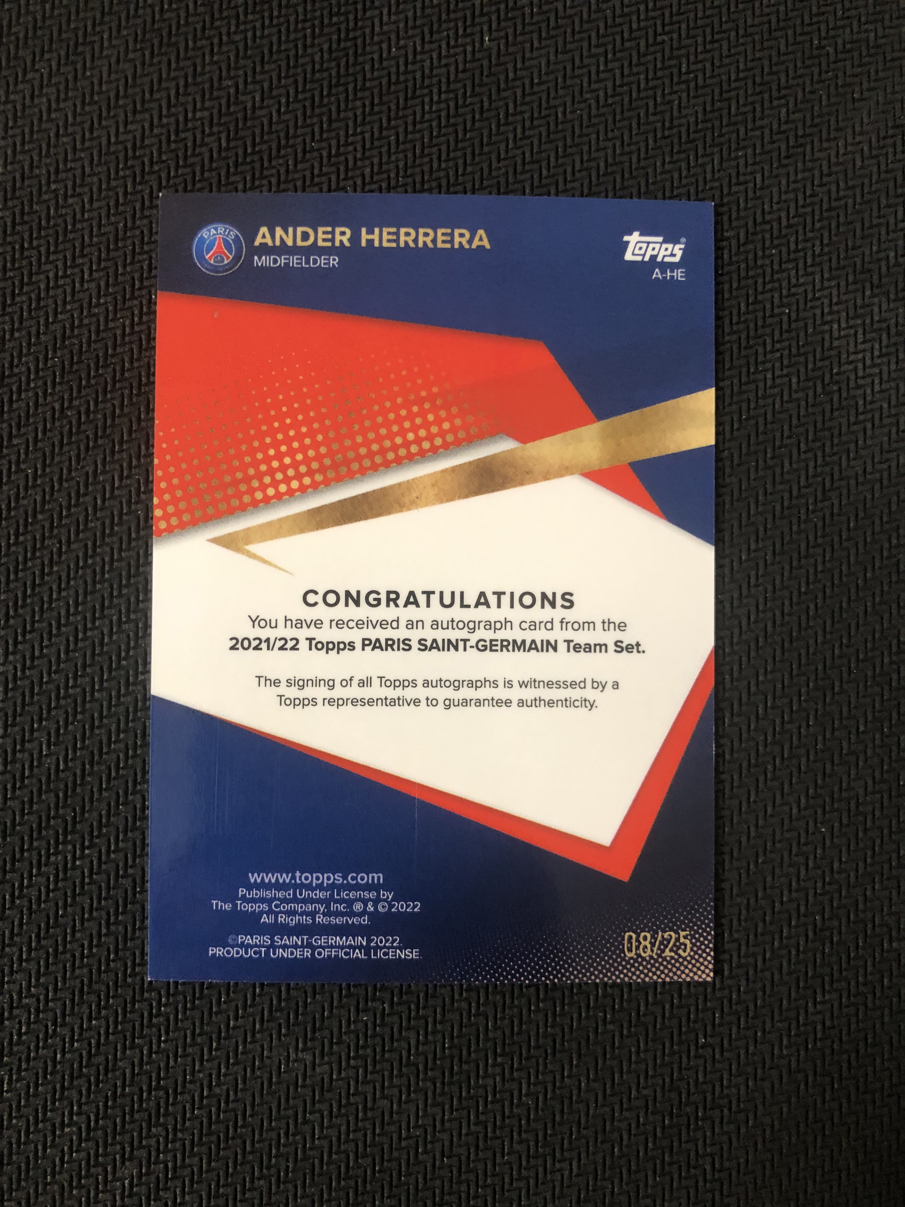 2022 Topps 巴黎队盒 Ander Herrera 安德尔 埃雷拉 大巴黎 法甲 签字 签名 08/25编 瑕疵见图