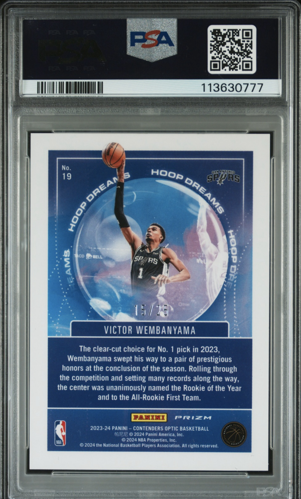 Victor Wembanyama 文班亚马 2023-24 Contenders Optic 球票 RC新秀 黑白折 15/25编 队服同色 PSA10分 豹子号 满分卡品 马刺队 投资收藏必备