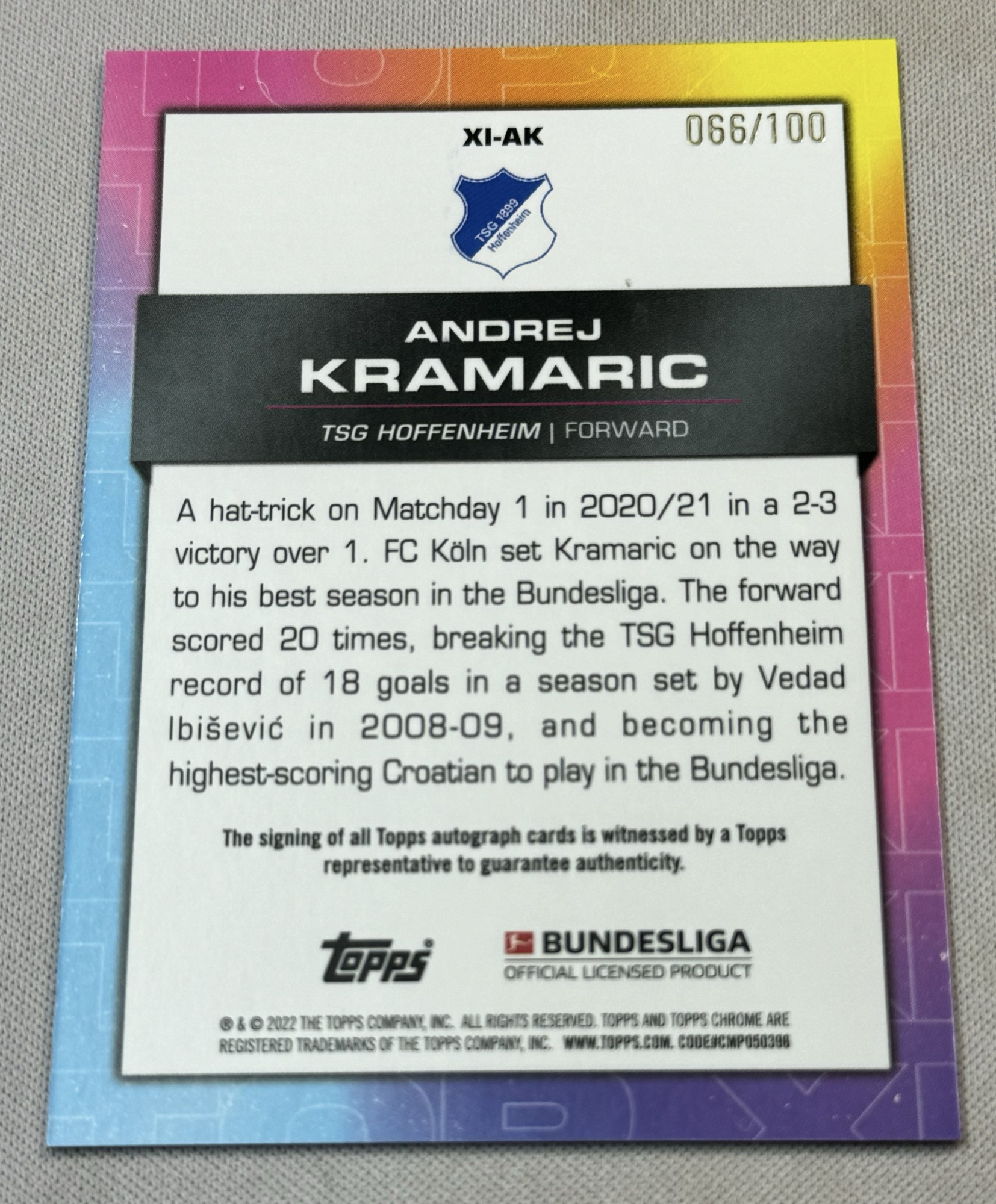 2022-23 Topps Chrome Andrej Kramaric 德甲TC 克拉马里奇 莱斯特城 霍芬海姆 克罗地亚🇭🇷 最佳11人 签字 银折 折射 066/100编 完美墨迹 不保卡品