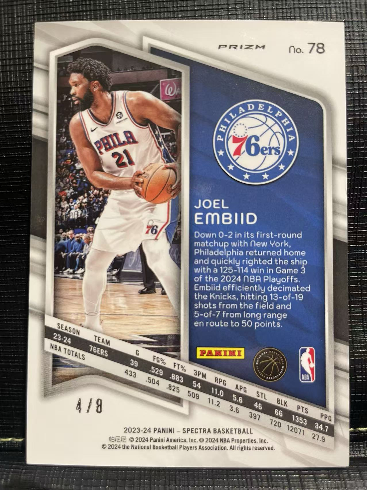 2023-24 Panini Spectra Joel Embiid 76人 大帝 乔尔 恩比德 8编!超低编!龙鳞折!限量卡!光谱高端折射!最新版!限量带编!值得珍藏💗一卡在手 以文会友💗