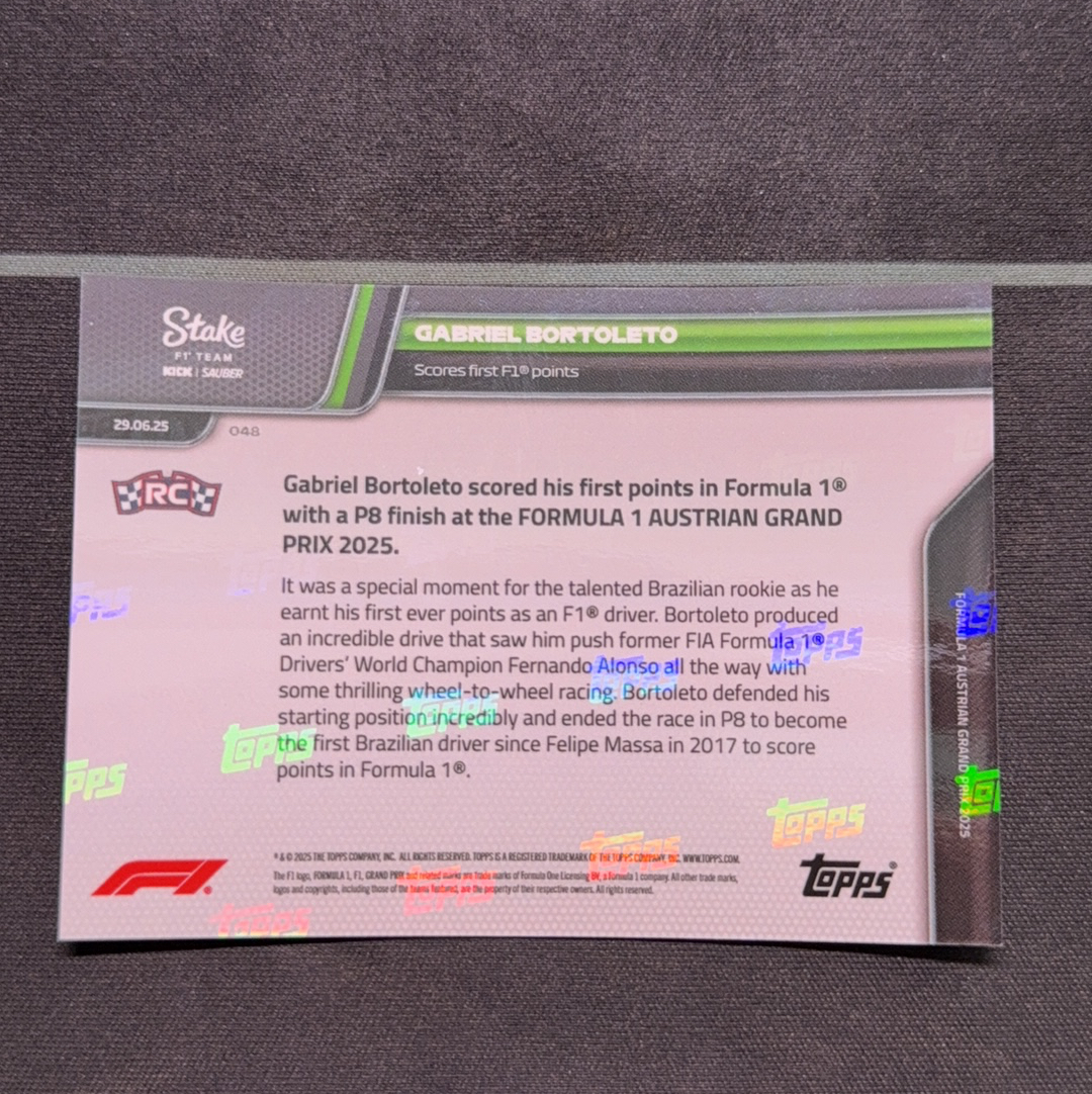 2024-25 Topps Now Gabriel bortoleto RC F1 F2博拖莱托 索博 F1新秀车手 索博 巴西人F1首秀 获得生涯第一个积分 霍肯伯格队友 实卡精美 收藏凑套必备