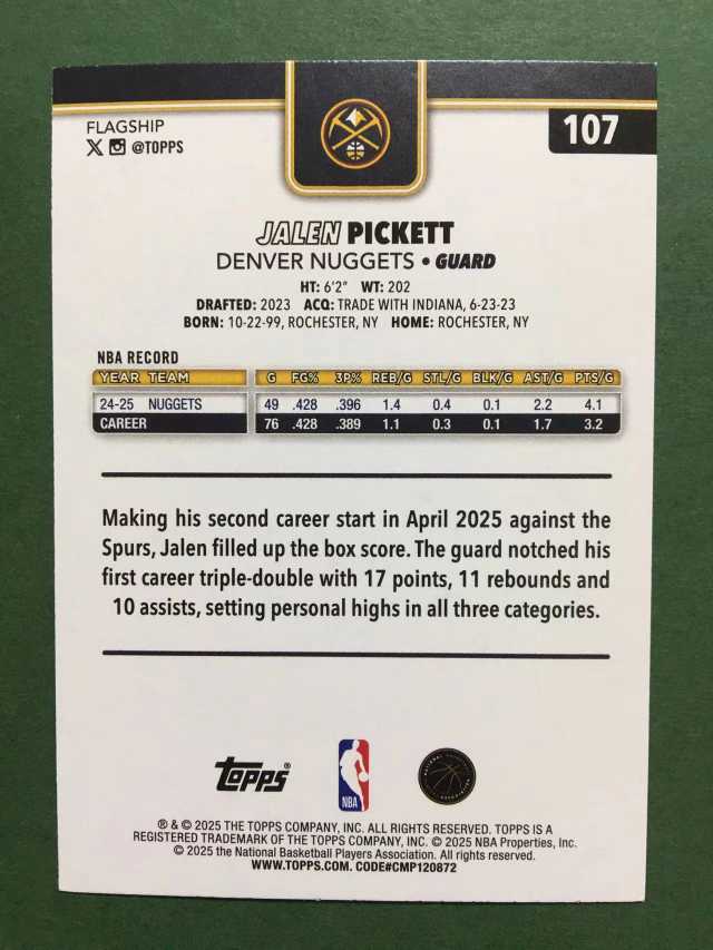 2025 Topps Flagship Jalen Pickett 掘金 杰伦 皮克特 2025编 年份编 铜折 折射 正base 约基奇 约老师 贾马尔穆雷 阿隆戈登队友 新赛季可期 卡品如图#黑子