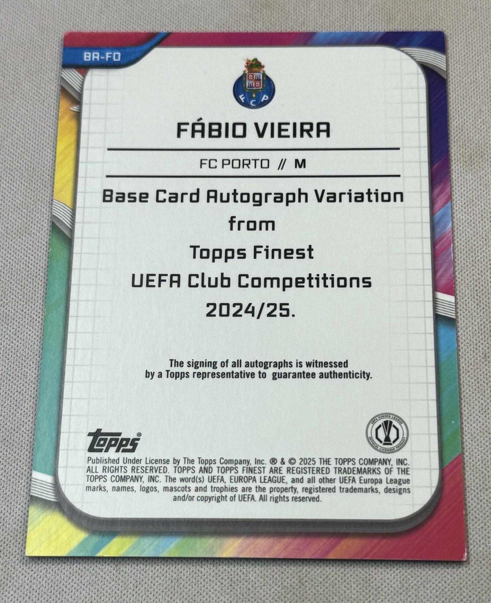 2024-25 Topps Finest Fabio Vieira 欧战finest 法比奥 维埃拉 阿森纳 波尔图 葡萄牙🇵🇹 签字 银折 折射 全能中场 豪门猎物 实卡精美 完美墨迹 不保卡品