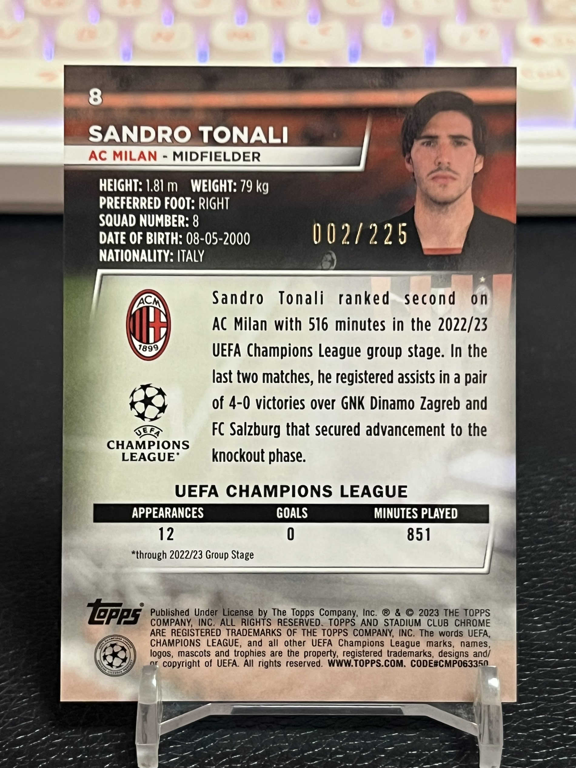 【浩行拍卖 截标预付82%】2023 topps stadium club chrome sandro tonali 欧冠竞技场 AC米兰 桑德罗 托纳利 绿折 折射 捧杯 奖杯 2/225编 专收必备 瑕疵看图「枳诗」1115F05祺