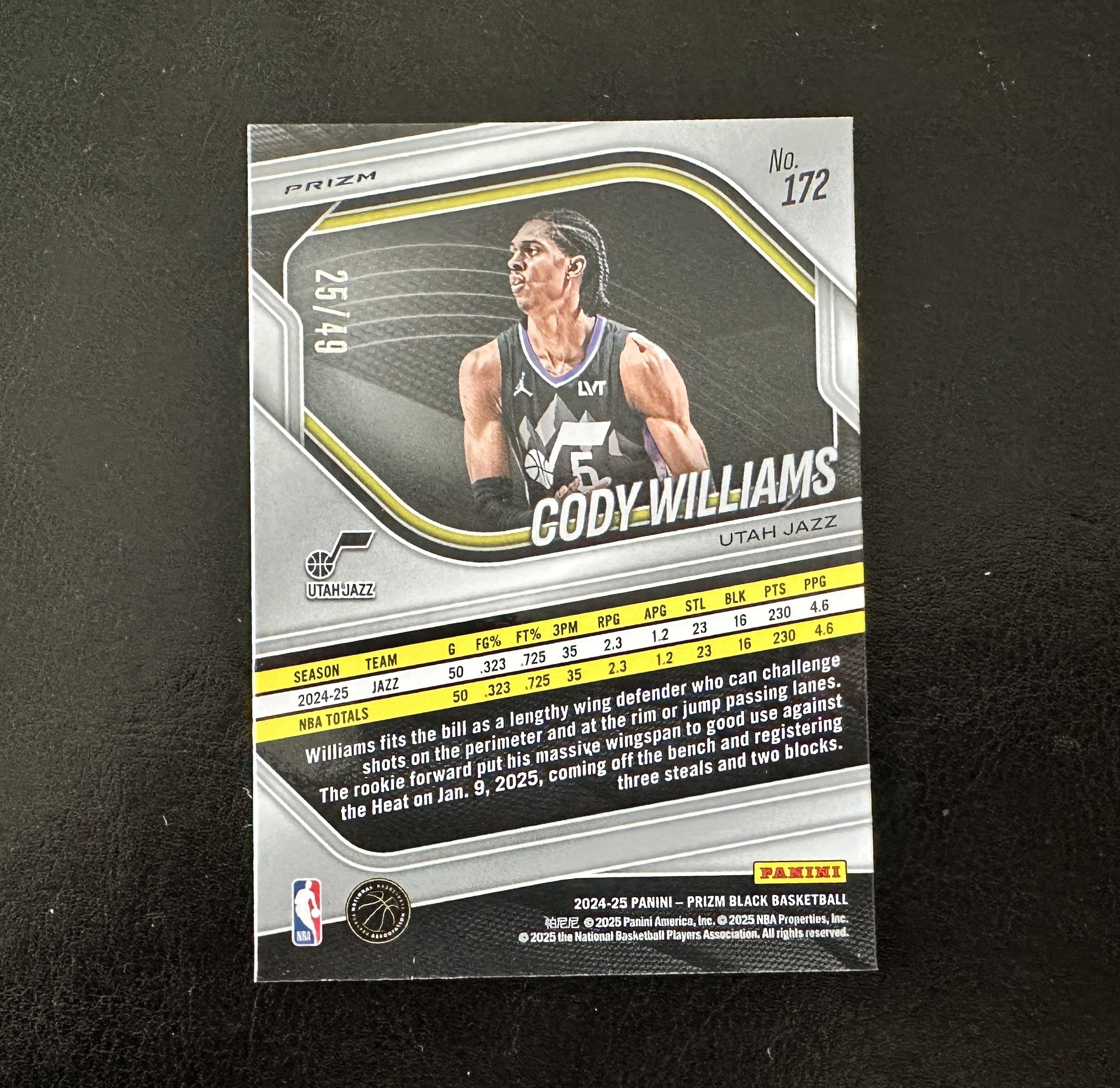 2025 Panini Prizm Black Cody Williams RC 爵士队 新秀 科迪 威廉姆斯 新秀 /49编 折射 橙折 卡品如图 @烙铁