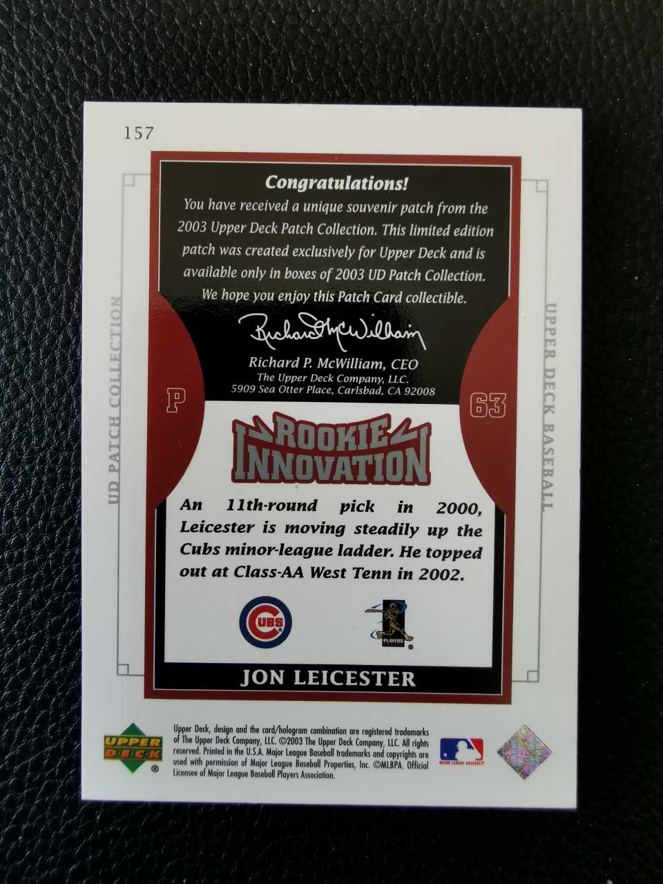 【金矿拍卖】2003 upper deck ud rookie innovation 芝加哥UBS 乔恩莱斯特 Jon leicester 超暴力棒球设计patch 限量款 框轻印 小天