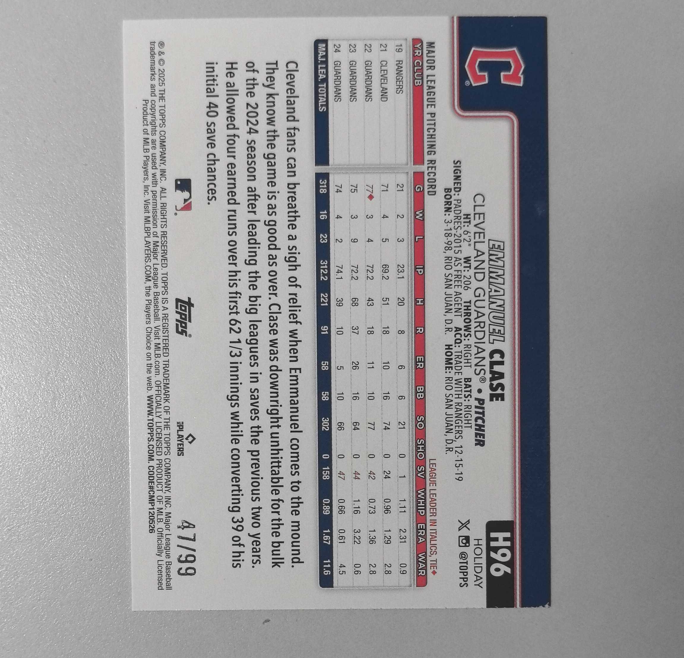 2025 Topps 【锡安代卖】 累计照常 棒球mlb 圣诞假日盒 紫平行99编 克利夫兰守护者巨星 Emmanuel Clase 卡品如图 帕哥