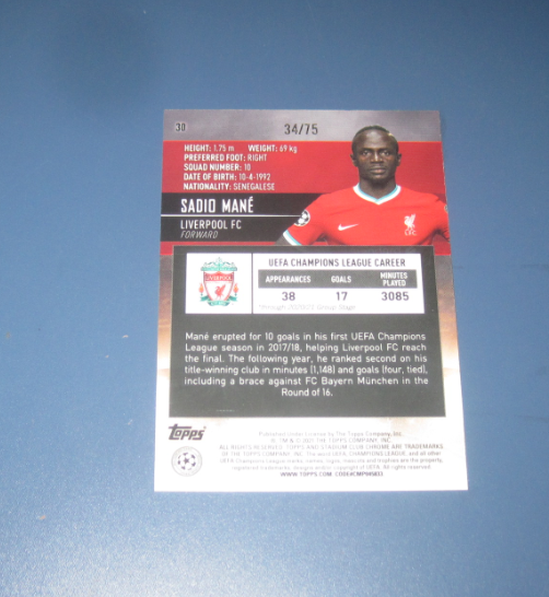 2020-21 Topps Stadium Club Sadio Mane 【凯哥拍卖】 欧冠 竞技场 球星卡 折射 限量 75编 利物浦 马内 极微小瑕疵 品相如图
