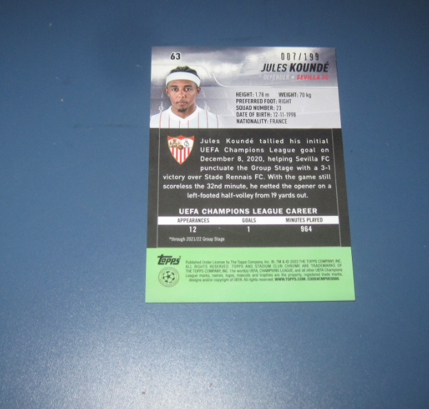 2021-22 Topps Stadium Club Jules Koundé 【凯哥拍卖】 欧冠 竞技场 球星卡 折射 限量 199编 塞维利亚 孔德 极微小瑕疵 品相如图