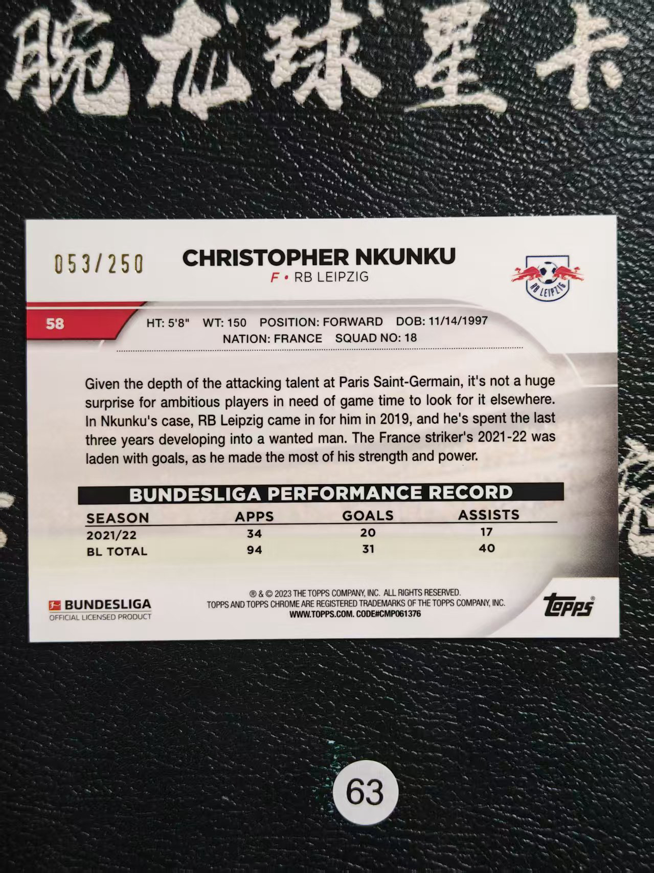 2023 【腕龙拍卖 接代卖】 腕龙E总AO4 Topps Chrome 德甲 TC 恩昆库 莱比锡红牛 切尔西 银棋盘折 53/250编 CHRISTOPHER NKUNKU 卡品如图 收藏必备