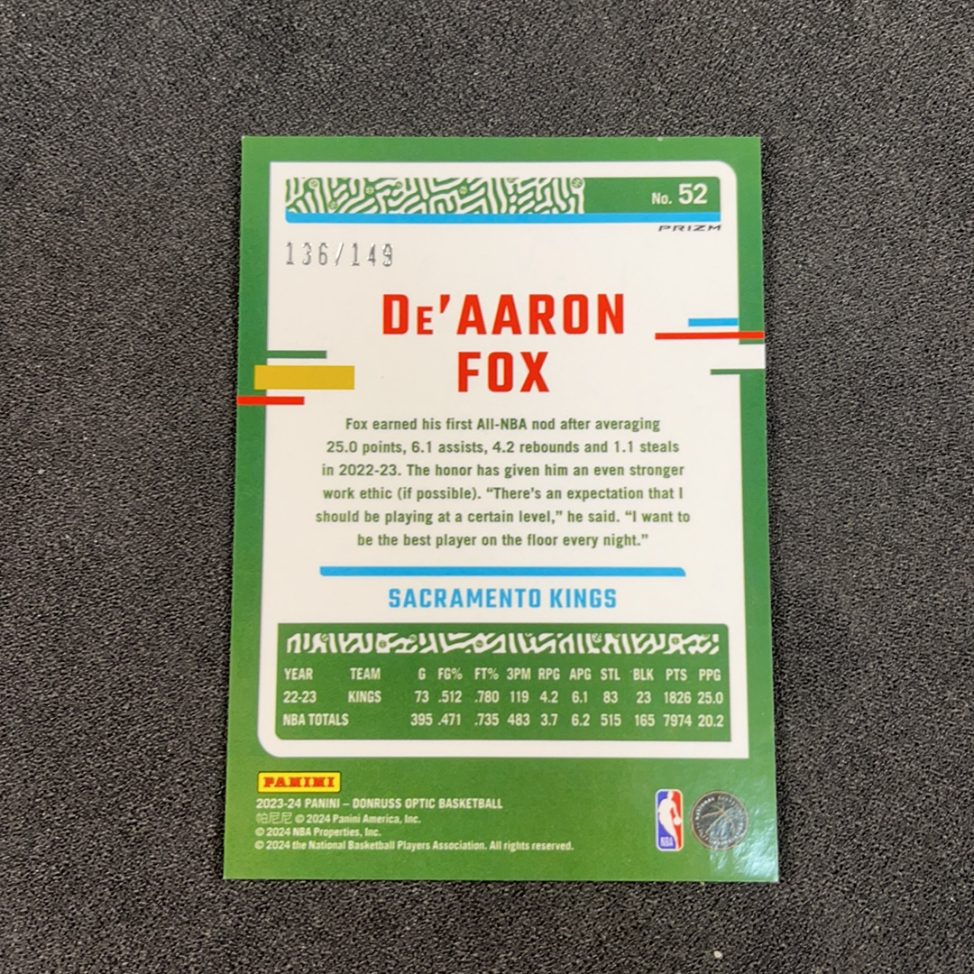 2023-24 Panini Optic De'Aaron Fox 达龙 福克斯 国王 OP 折射 149编 绿折 凑套必备 卡品如图
