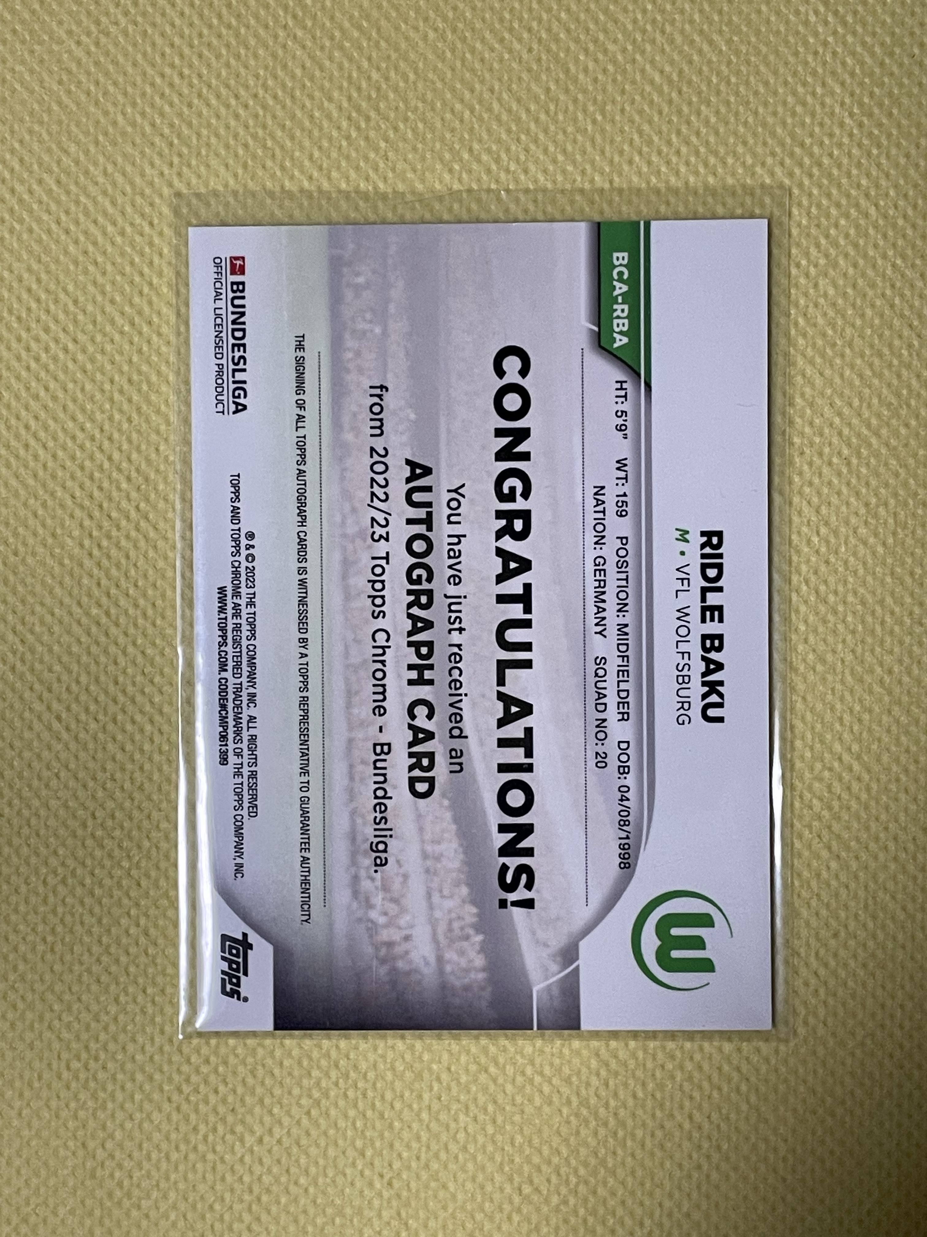 2022-23 Topps Chrome Bundesliga Ridle Baku 德甲TC 里德 巴库 沃尔夫斯堡 签字 卡品如图 收藏必备