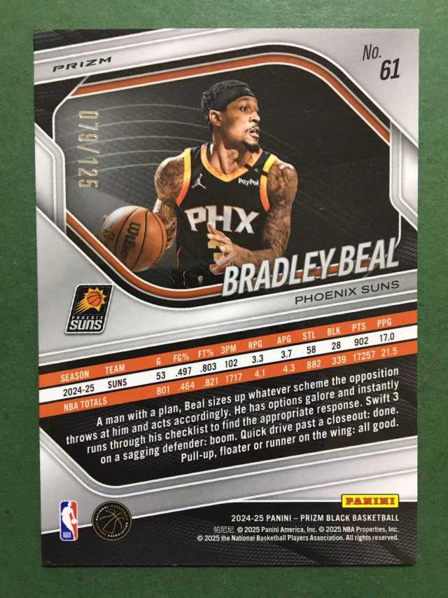 2024-25 Panini Prizm Bradley Beal pz BLACK 太阳 布拉德利 比尔 125编 蓝碎冰折 蓝折折射 base 快船 哈登 伦纳德队友 专收必备 卡品如图#黑子