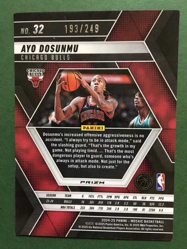 2024-25 Panini Mosaic Ayo Dosunmu 马赛克 公牛 阿约 多孙姆 249编 橙马赛克折 橙折 折射 正base 布泽利斯 科比怀特队友 新赛季可期 卡品如图#黑子