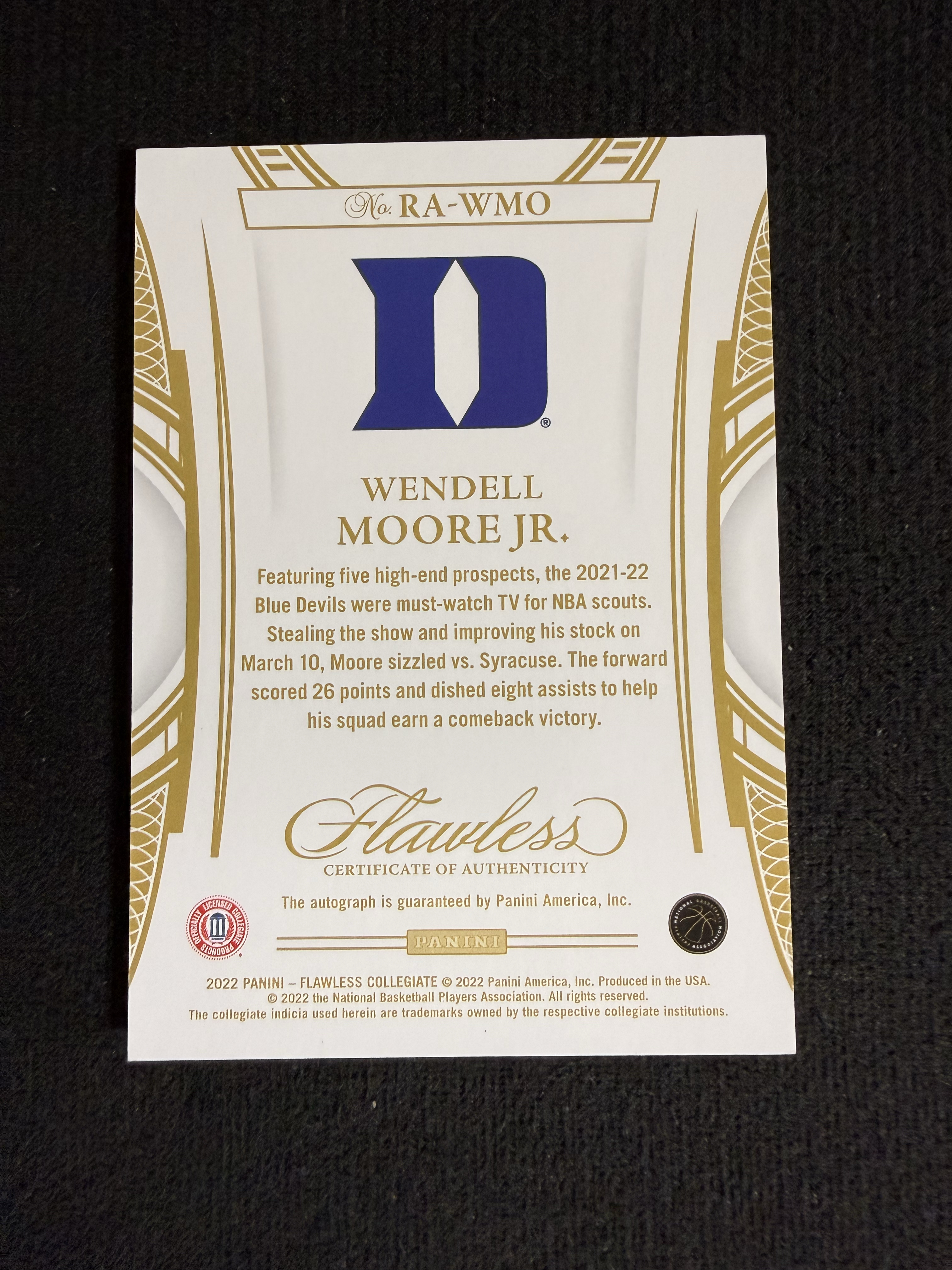 2022-23 Panini Flawless Collegiate Wendell Moore Jr. RC 杜克大学 手提 温德尔 摩尔 新秀 卡签 签字 25编 高端系列 收藏必备 (新安洲)