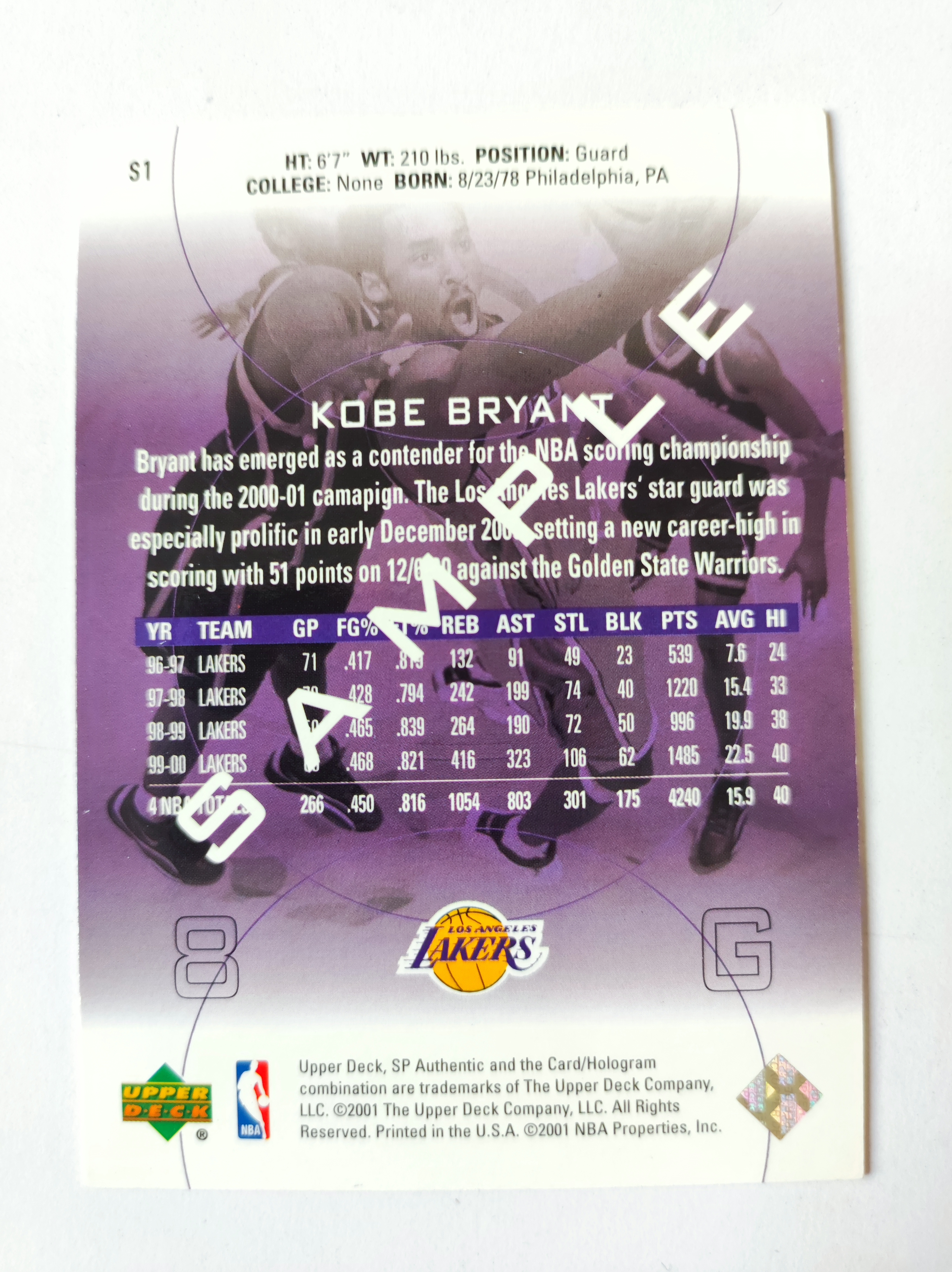 2001 Upper Deck SP Authentic Kobe Bryant 科比 布莱恩特 老大 黑曼巴 稀有 老卡 四大分卫之一 收藏必备 瑕疵看图