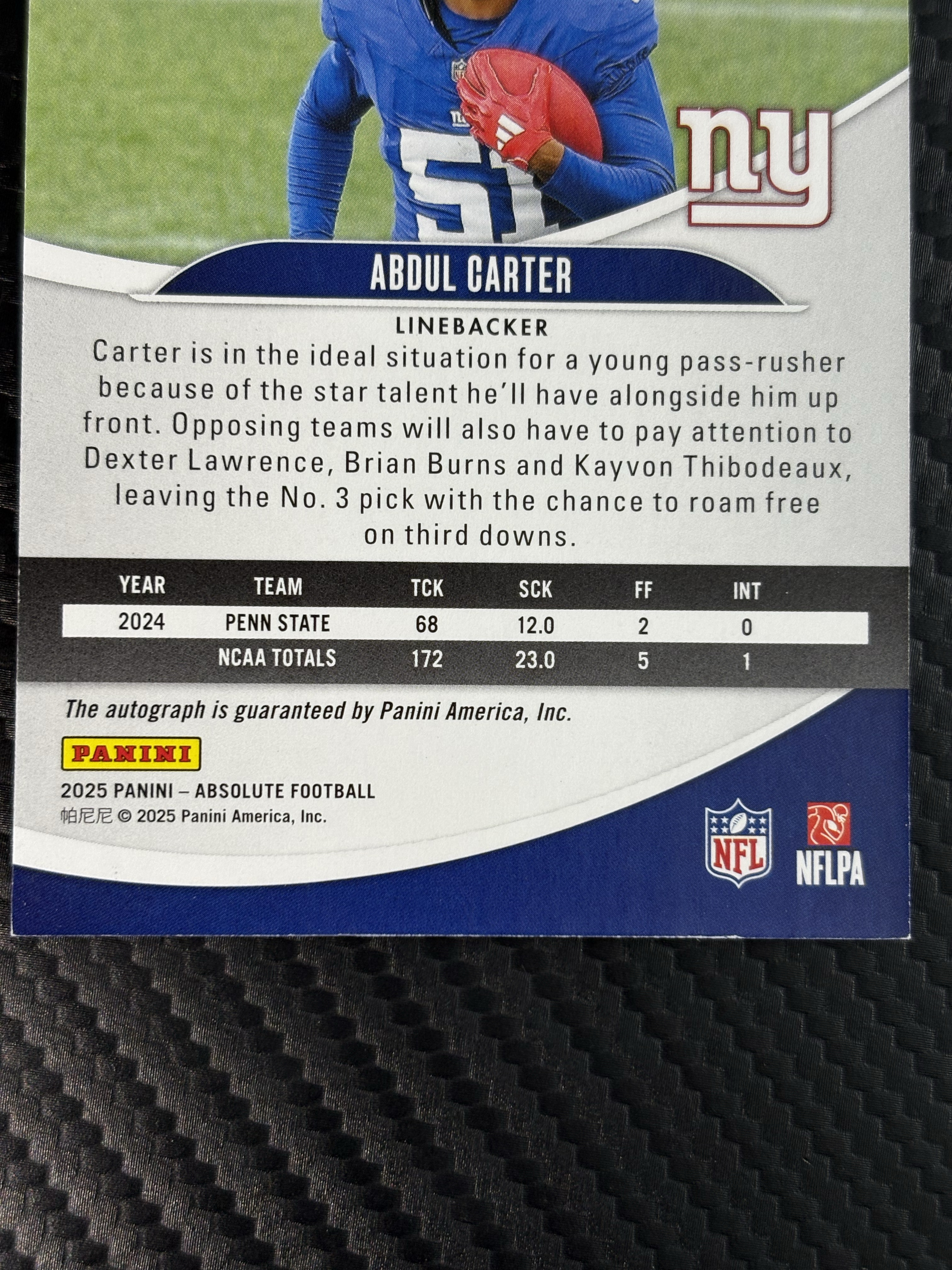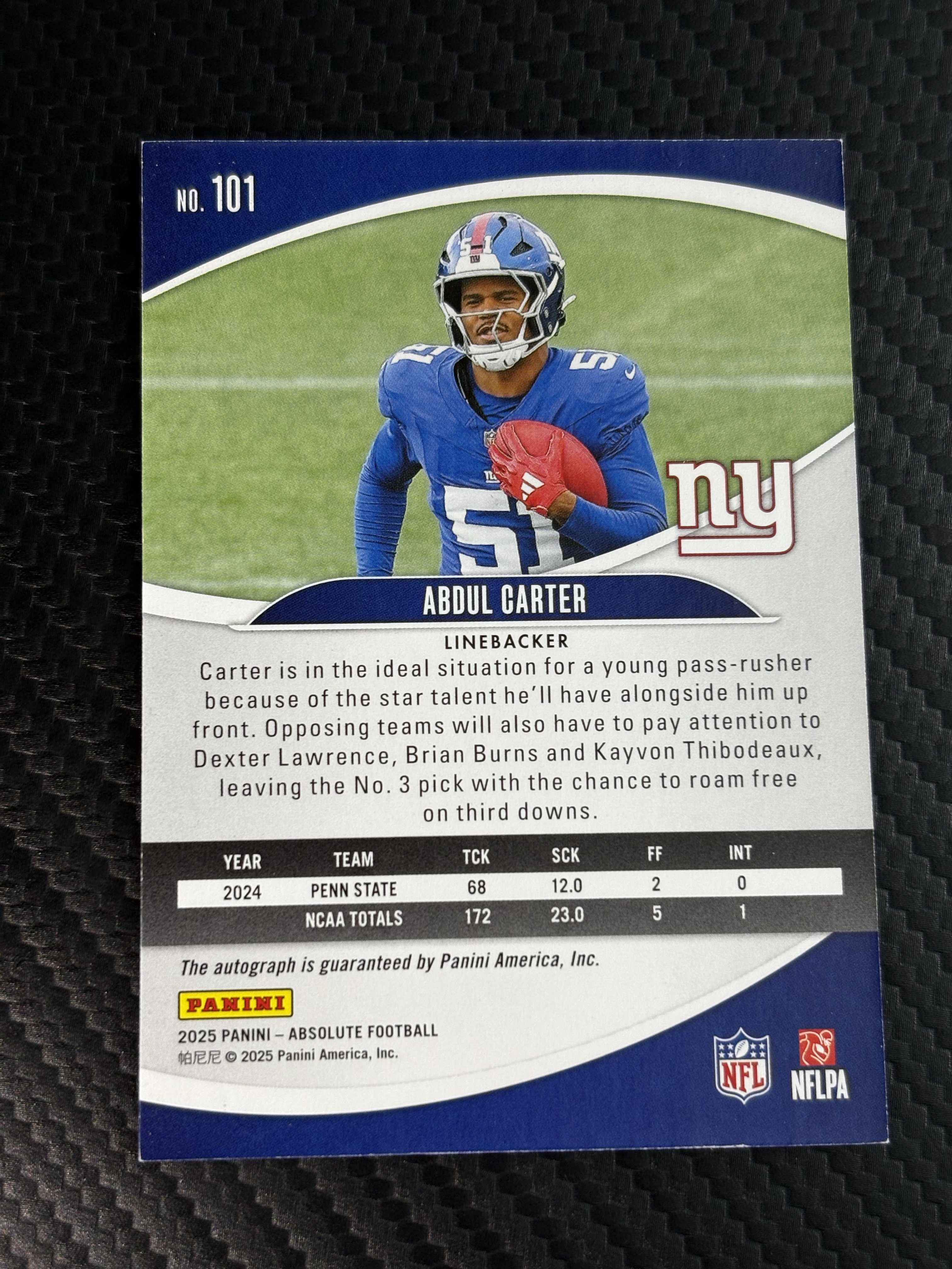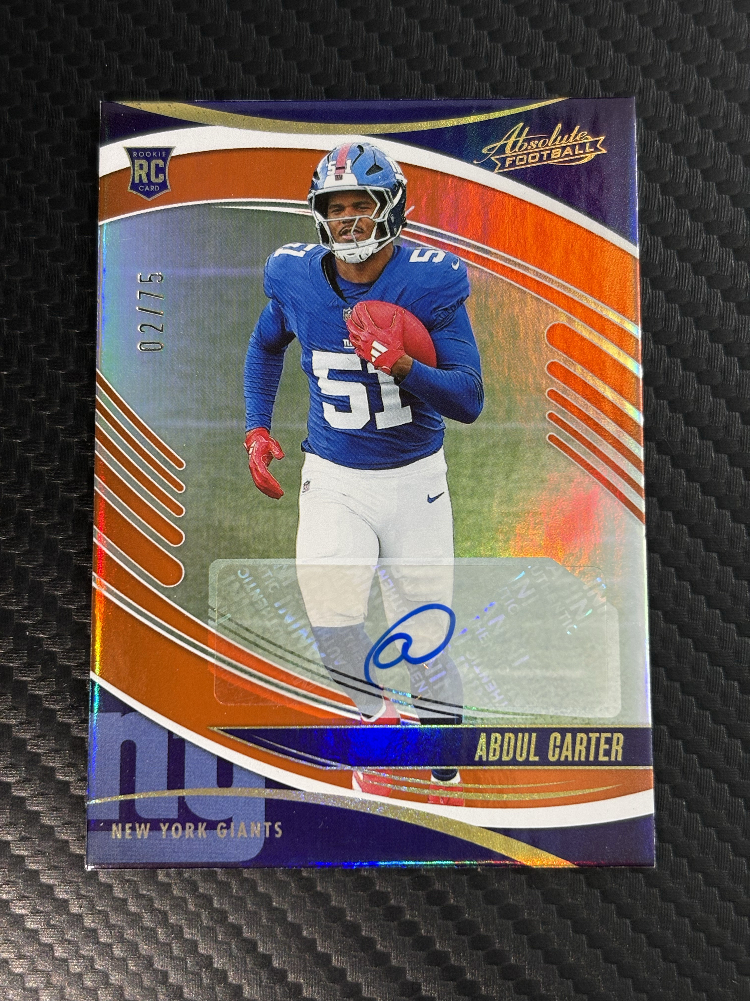 【面包拍卖】 2025 Panini Absolute Abdul Carter 橄榄球 新秀RC 阿卜杜勒 卡特 阿卜杜尔 卡特 纽约巨人队 RC 正新秀 签字 贴签 02/75编 瑕疵看图 鹏哥