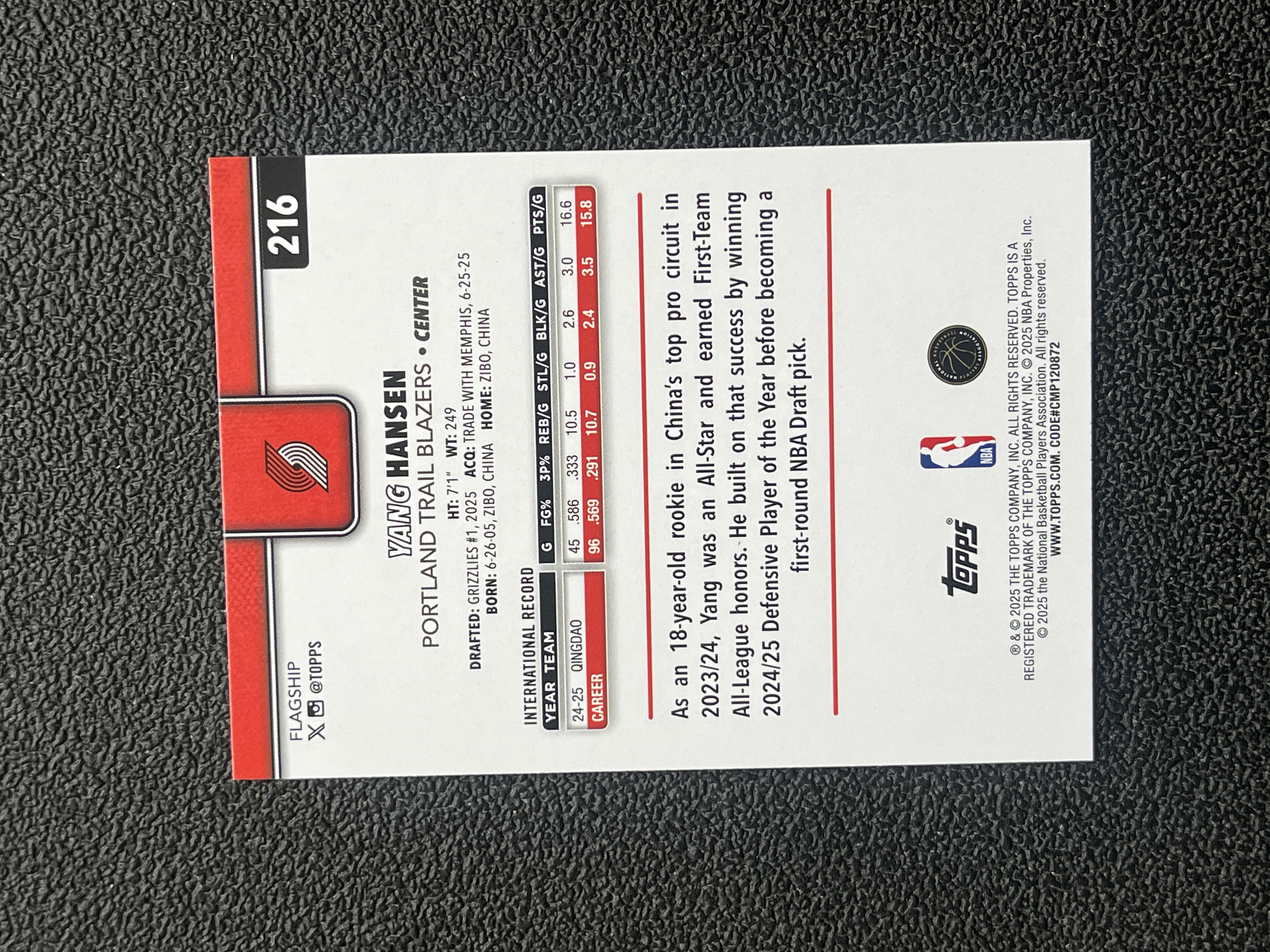 2025 Topps Topps Yang Hansen RC 【艾比拍卖】 开拓者 新秀 杨瀚森 折射 银折 base 专收必备 卡品如图 丹总